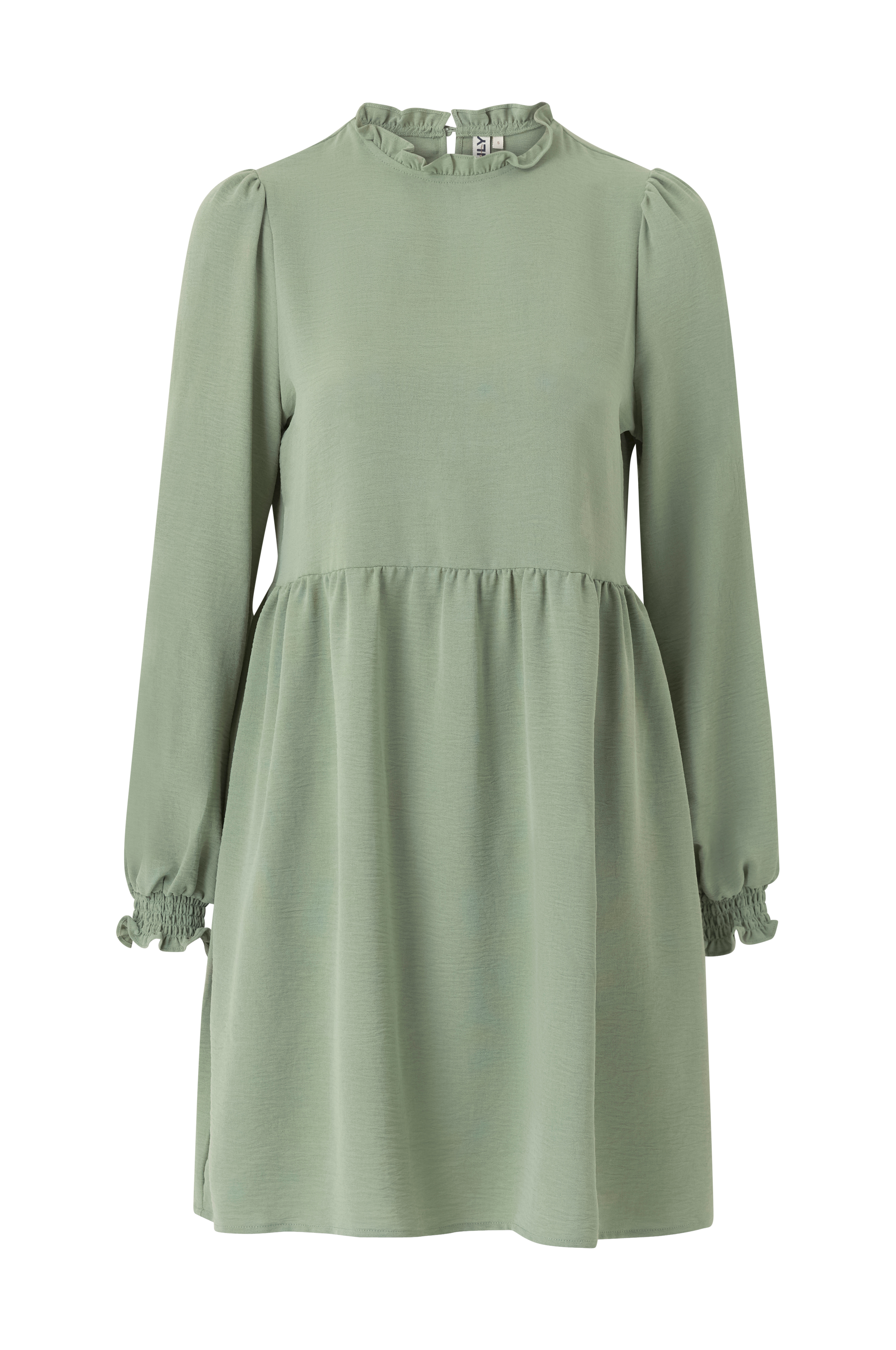 • Høj halsudskæring med volant • Ventilation med knap i nakken • Lange ærmer med smock ved manchetterne • Rynket talje • Længde: 90 cm i størrelse S • Produktet indeholder genindvundet materiale, som genbruges for at reducere mængden af affald samtidigt med at der ikke anvendes nye ressourcer.