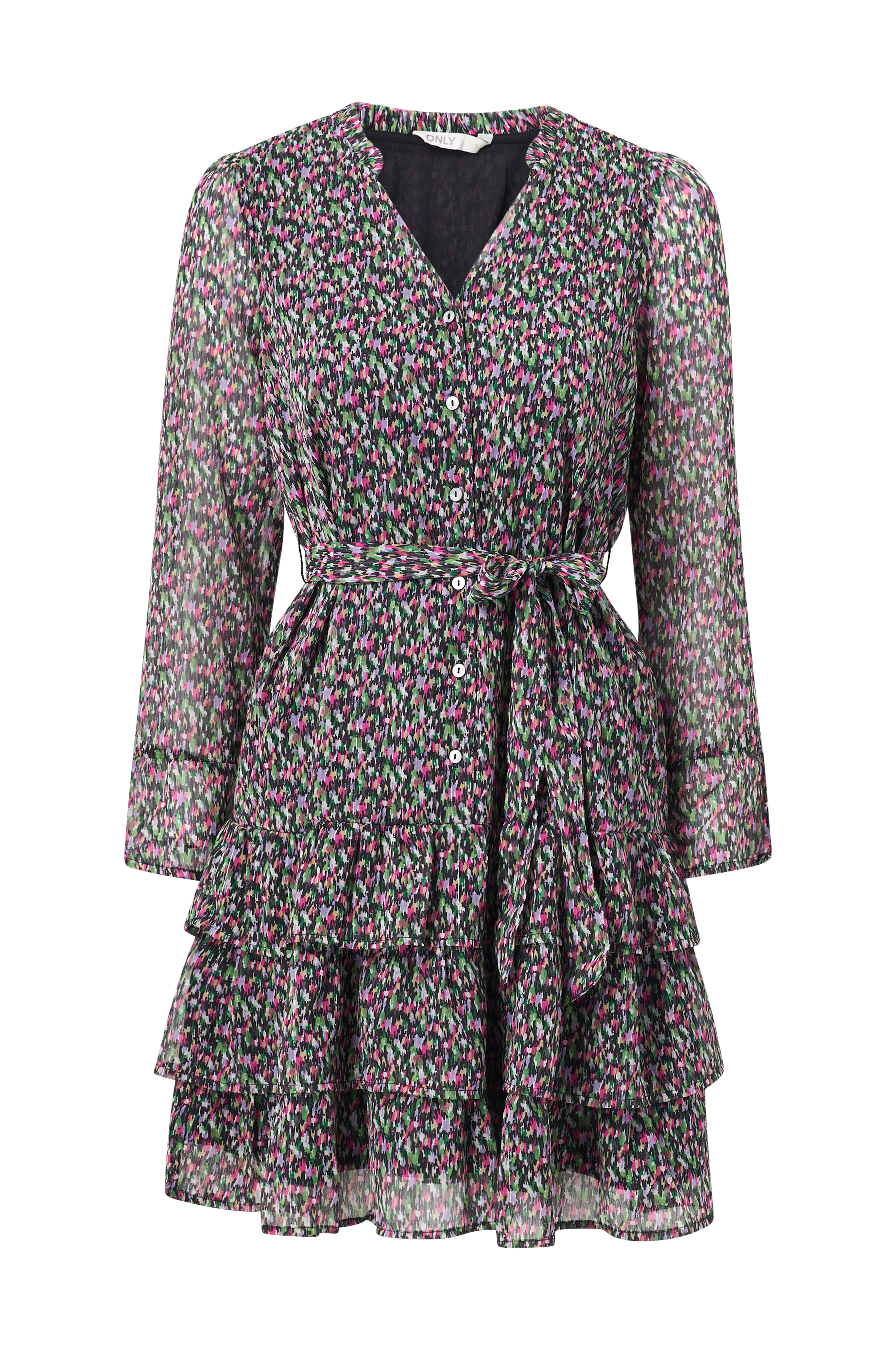 • Model med svaj i chiffon crepe• Rund hals med lille volant og v-udskæring foran• Knapstolpe foran• Ballonærme med ventilation ved manchetterne• Bæltespænde ved taljen• Volanter nederst• Foret• Længde: 91 cm i størrelse S
