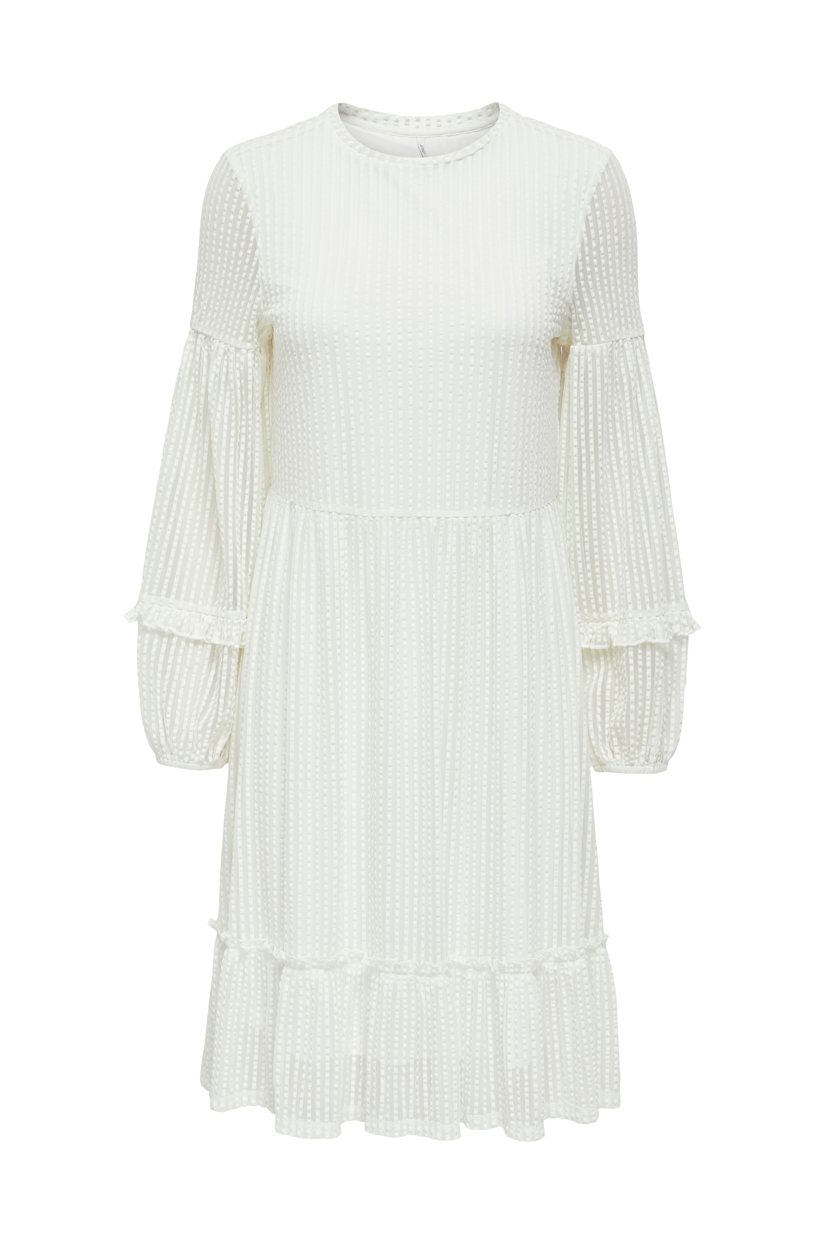 Kjole i mesh med stribet bæk-og-bølge-effekt. Rund hals med lille kant og lange, vide ærmer med afskæring foroven og forneden med flæse samt indsat elastik i ærmekanterne. Afskæring med rynkning i taljen og påsyet flæse i kanten forneden. Længde ca. 97 cm i str. S.