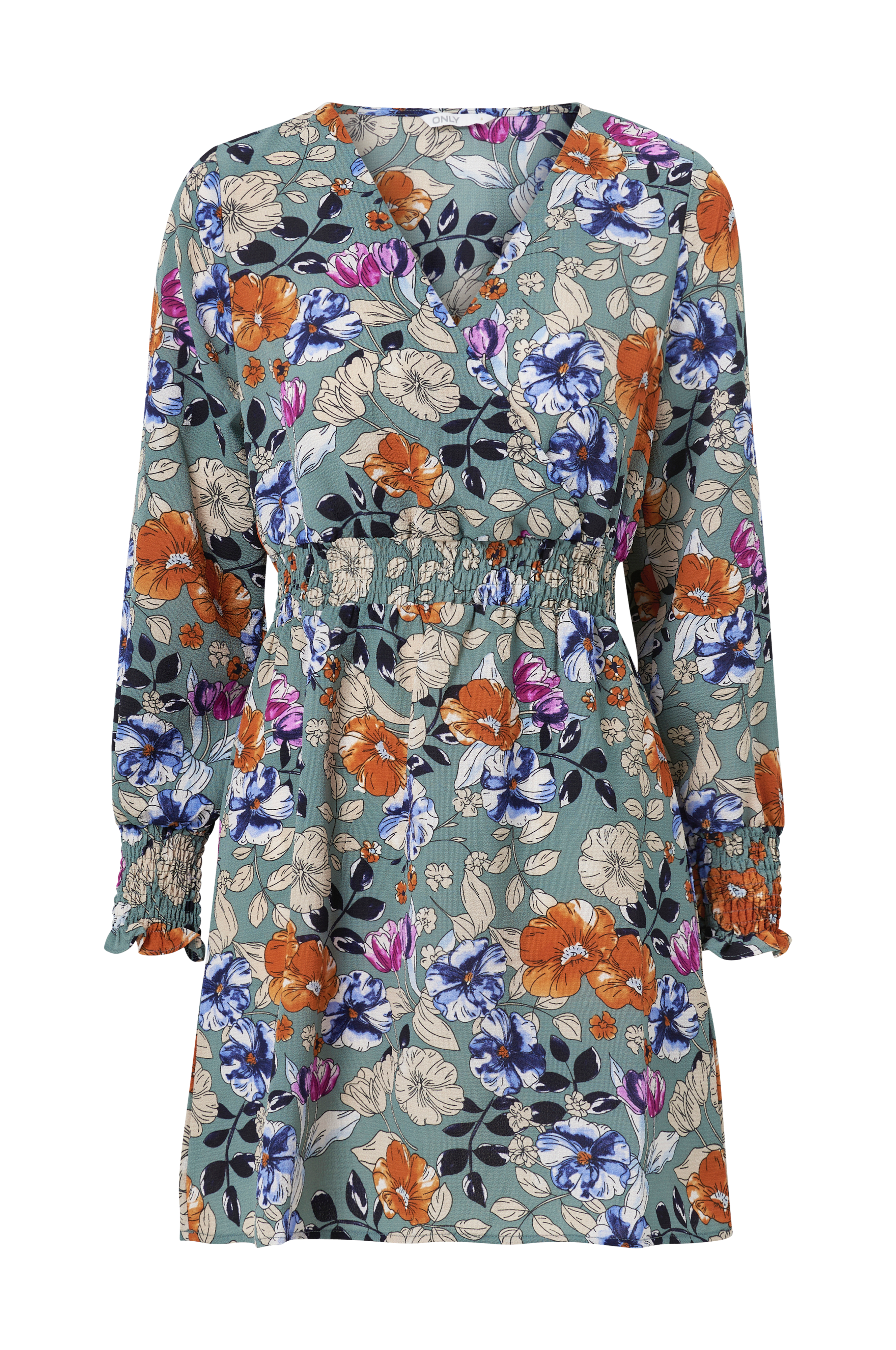 Kort kjole i vævet, mønstret kvalitet med crepet struktur. Markeret talje med bred smock. V-udskæring med slå-om foran og lange ærmer med bred smock i ærmekanten. Længde ca. 87 cm i str. S.