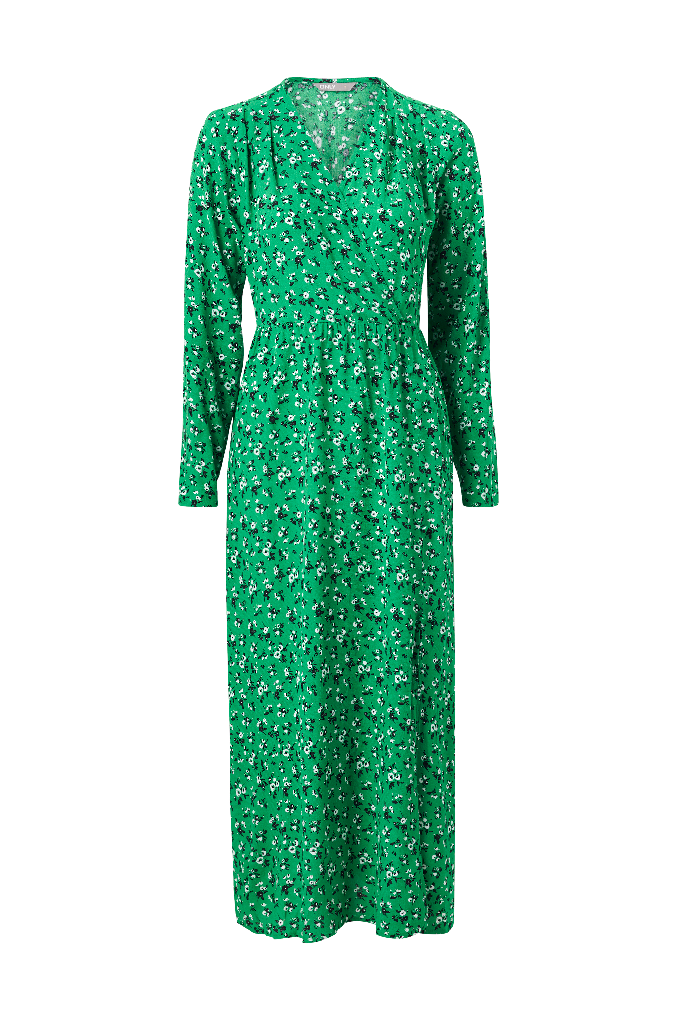 • V-udskæring med slå-om• Rynket elastik bagpå ved taljen• Lange ærmer• Slids foran• Længde: 129 cm i størrelse S