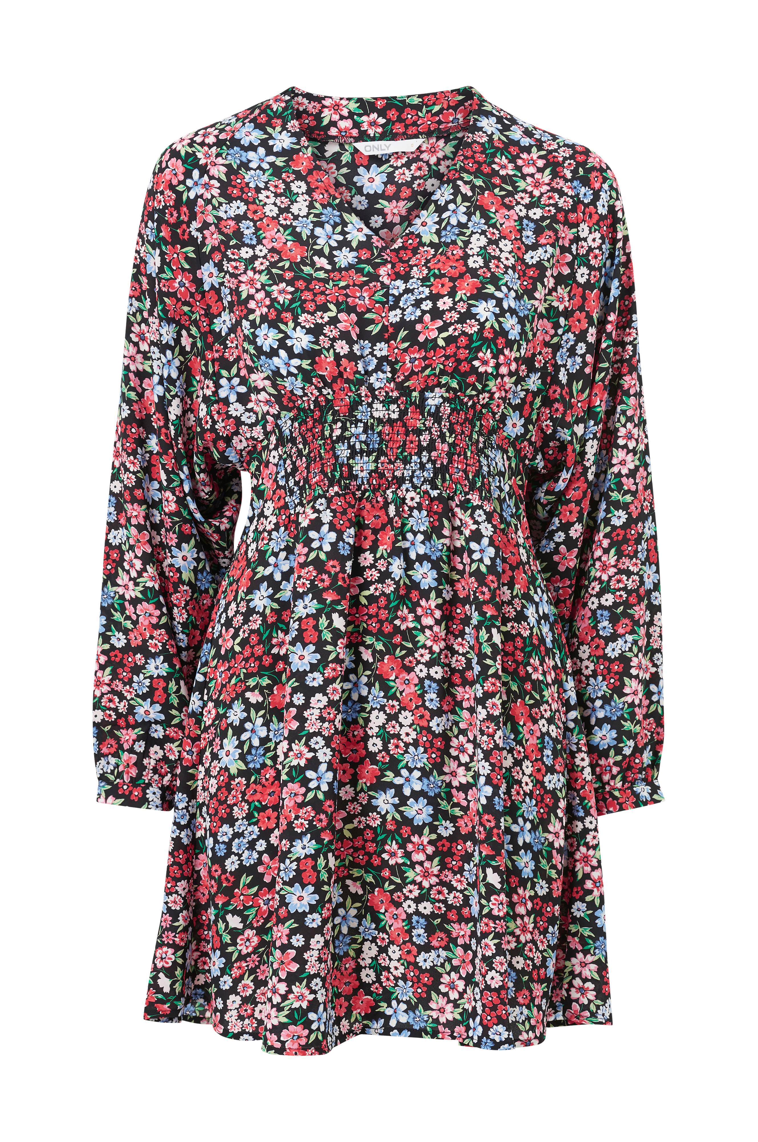 Let figursyet model med bred smockelastik midt foran og midt bagpå i taljehøjde. Ekstra vidde i ærmet med smal manchet i ærmekanten. Længde ca. 88 cm i str. S.