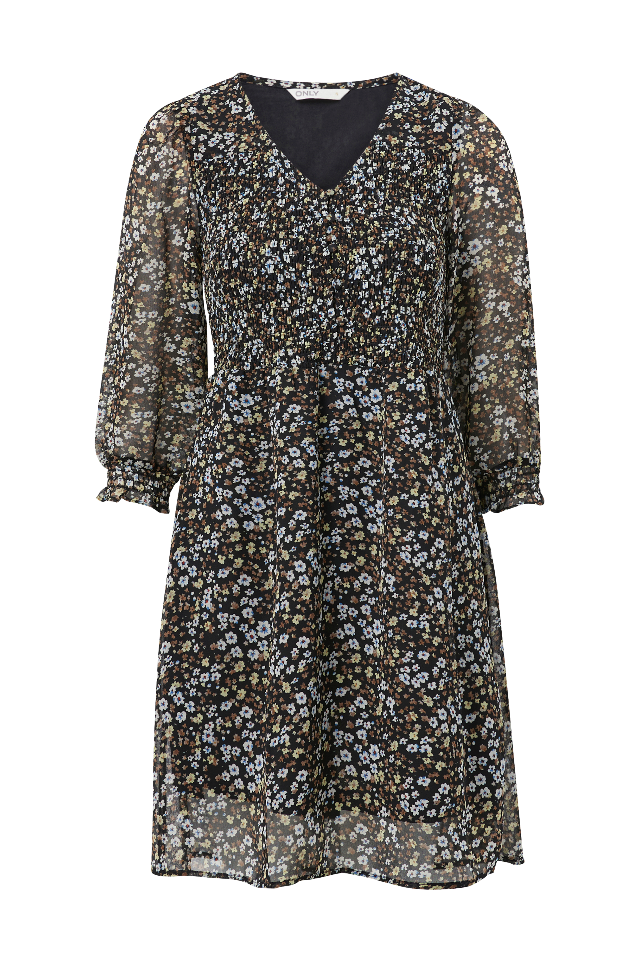 Figursyet kjole med smockelastik foroven både foran og bagpå. V-hals og kort stolpelukning med betrukne knapper samt vidde i underdelen. Pufærmer med rynkning ved skulderen og smockelastik i ærmekanterne. Længde ca. 93 cm i str. S.
