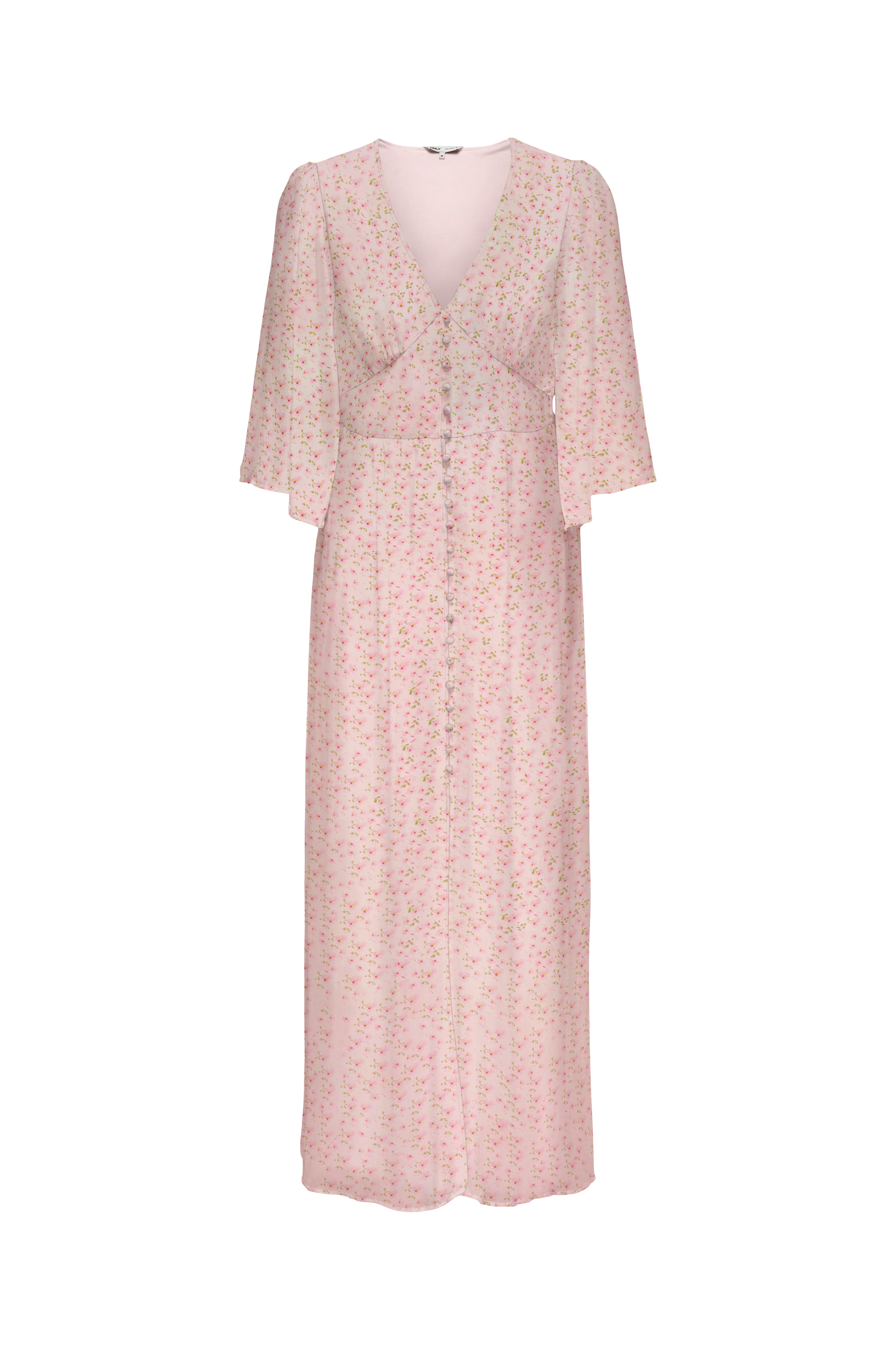 • Lang kjole i chiffon• V-udskæring• Beklædte knapper• 3/4 lange sommerfugleærmer• Smock bagpå ved taljen• Slids foran• Trikotfor• Længde: 136 cm i størrelse S