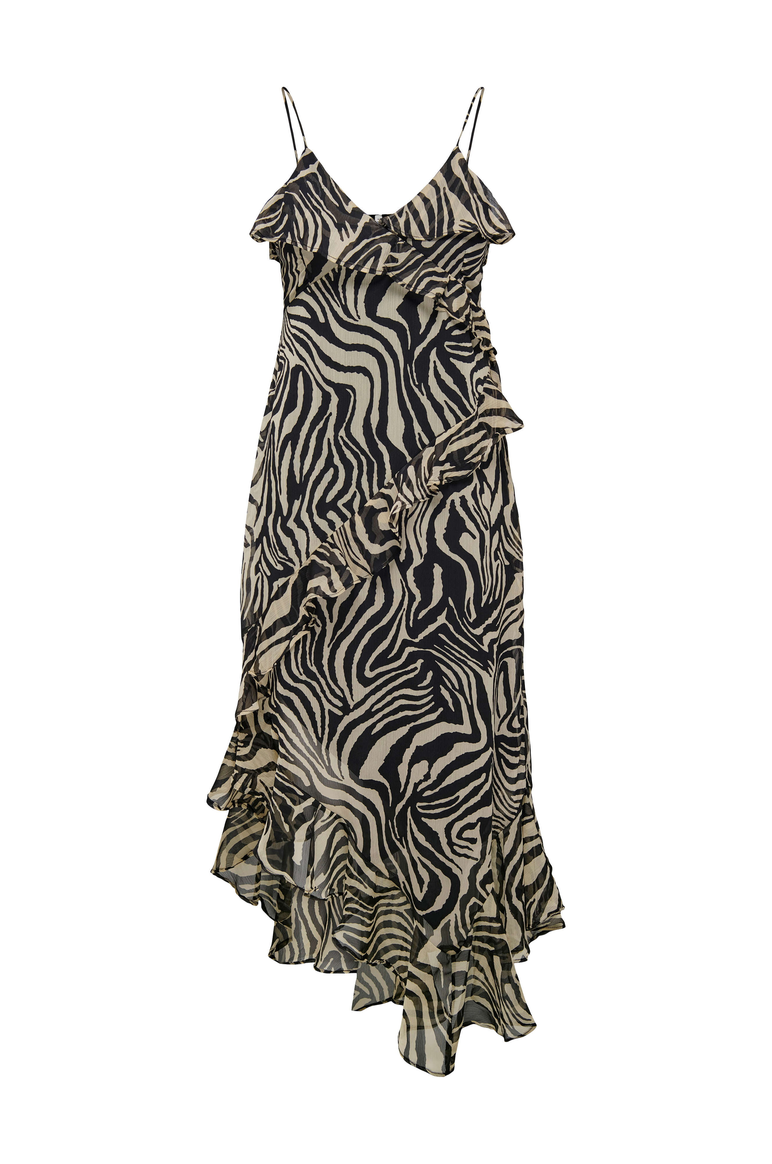 • Lang, zebramønstret kjole i chiffon med volanter• V-udskæring• Tynde, justérbare skulderstropper• Asymmetrisk søm• Slids i den ene side• Trikotfor• Længde: 130 cm i størrelse S
