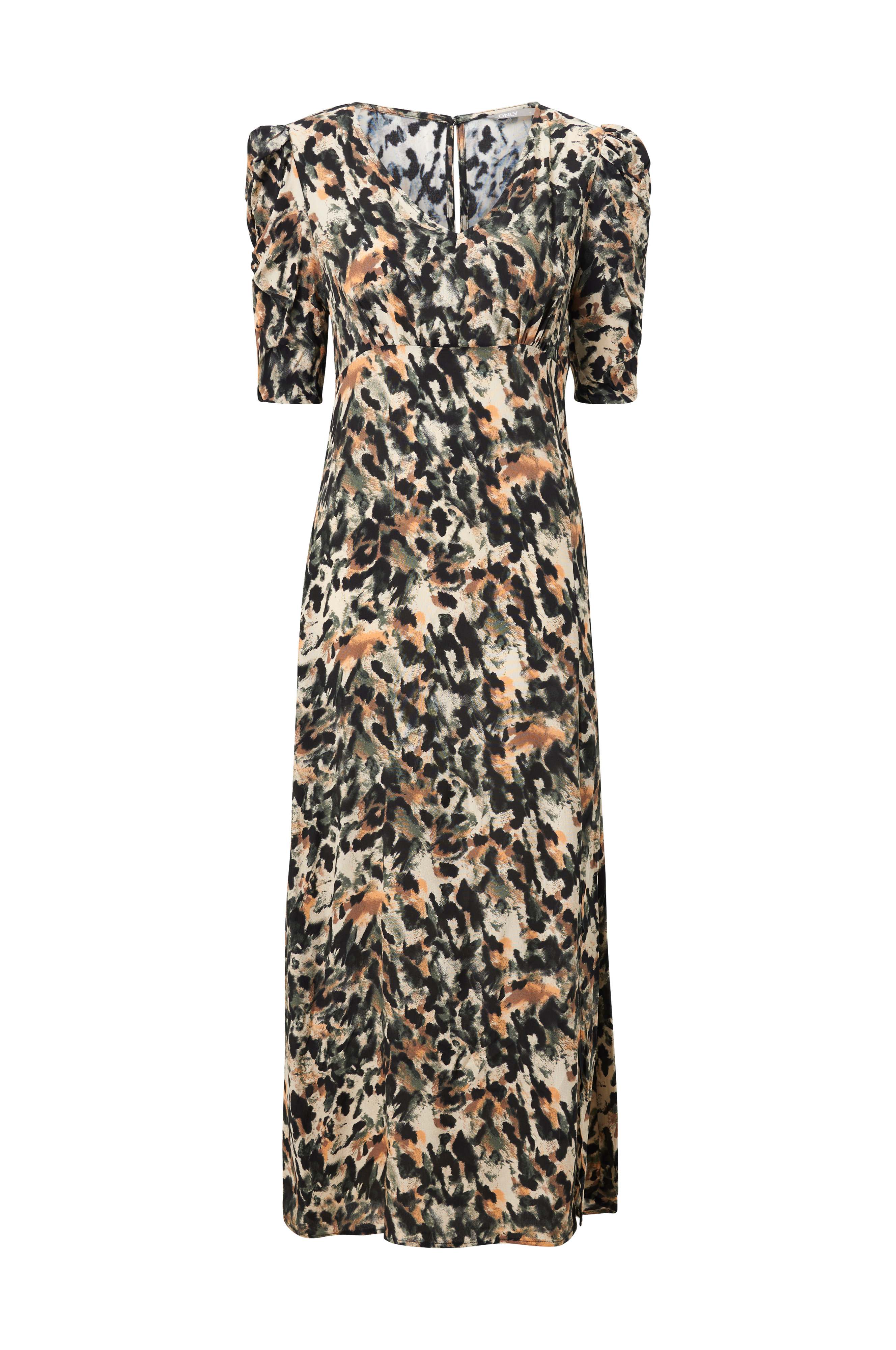 • Figursyet model• Markeret talje med vidde nederst• V-formet halsudskæring med dyb ventilation i ryggen• Kort ballonærme med elastisk drapering på oversiden• Høj slids nederst på siden• Længde: 139 cm i størrelse S