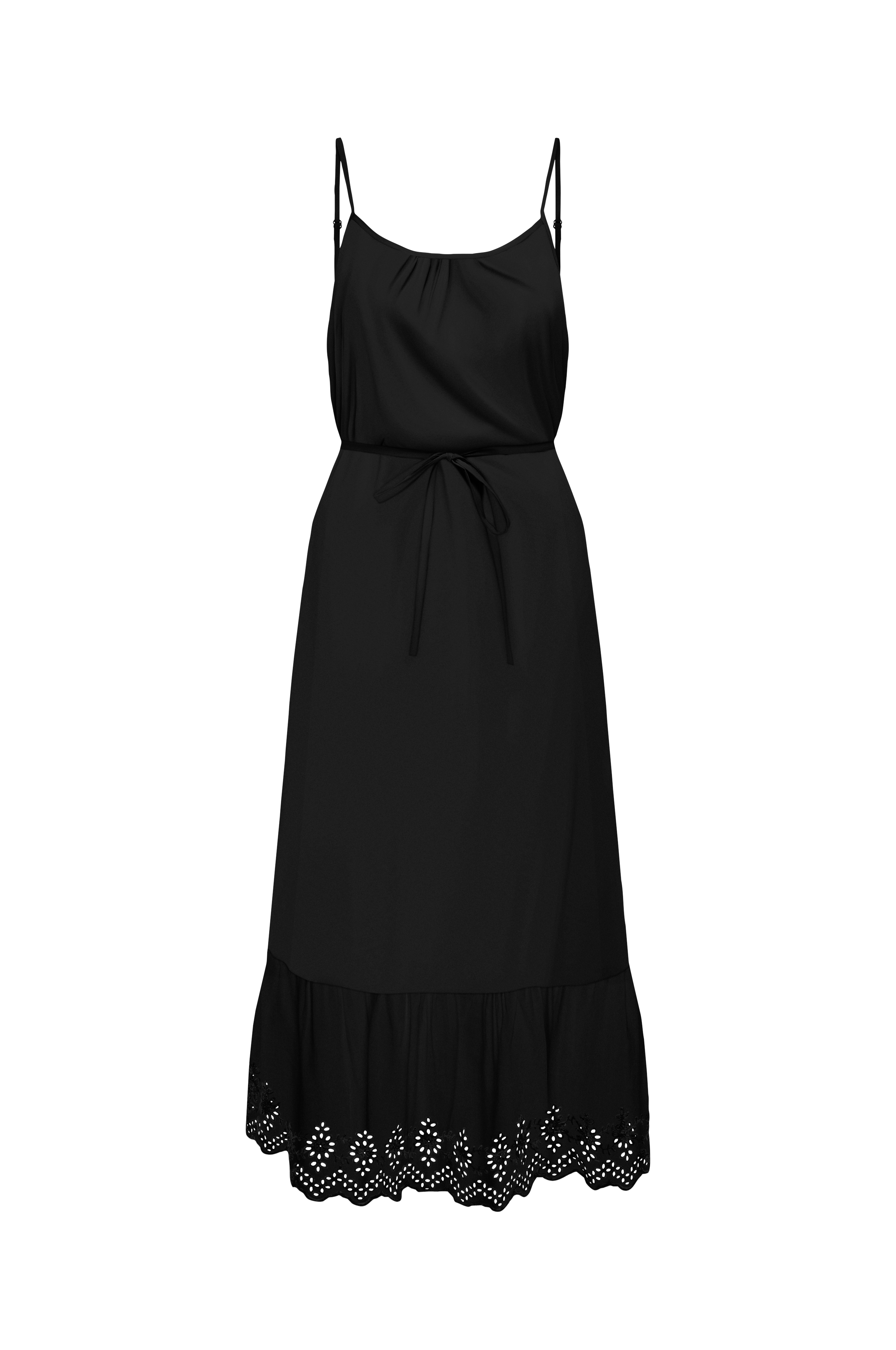 • Lang kjole• A-linje design• Tynde, justérbare skulderstropper• Tyndt bindebånd ved taljen• Broderet hulmønster nederst• Foret• Længde: 131 cm i størrelse S