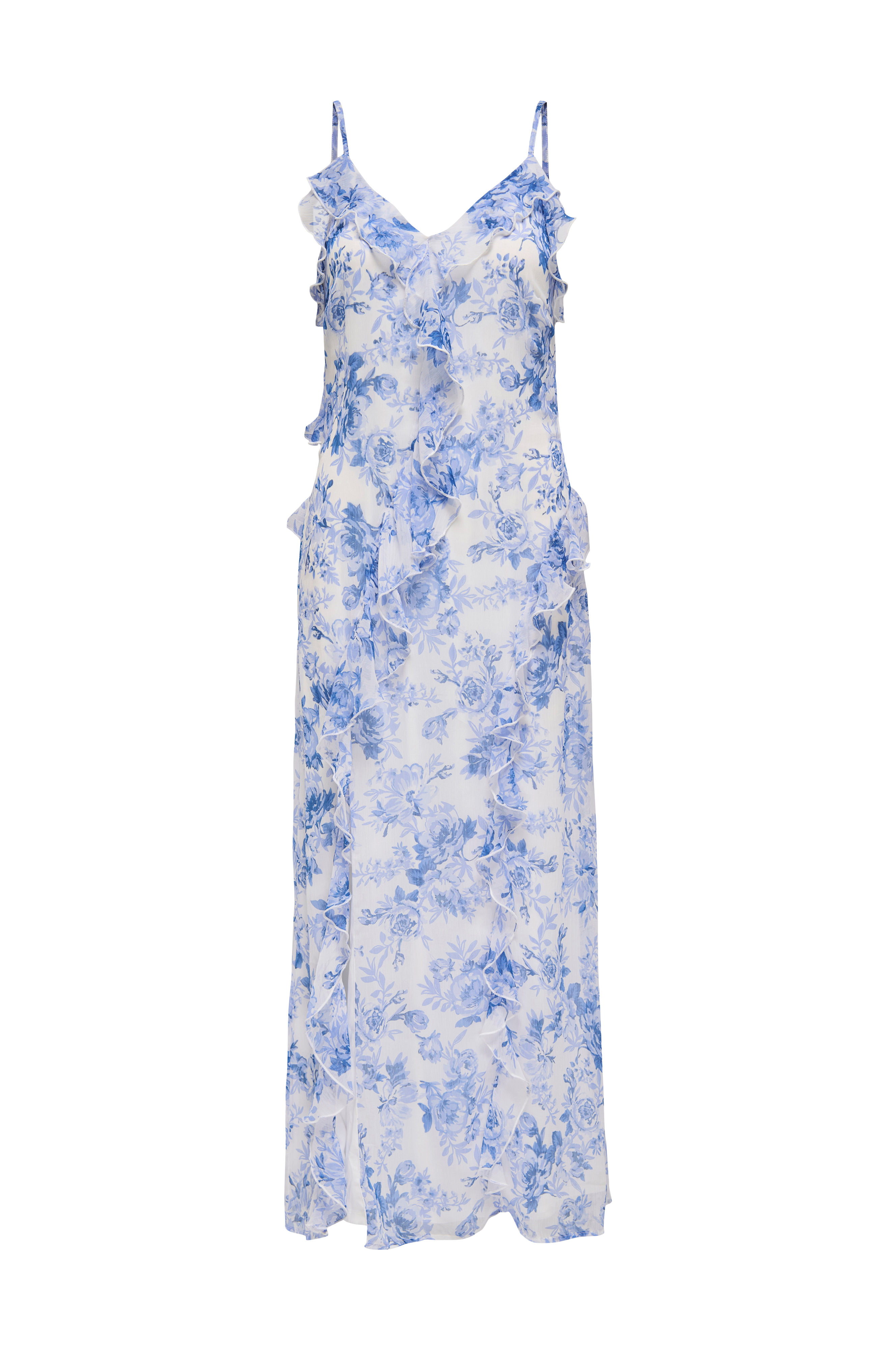 • Lang, ærmeløs model i chiffon crepe• V-formet halsudskæring• Tynde, justérbare skulderstropper• Påsyede volanter hele vejen rundt• Foret• Længde: 134 cm i størrelse S