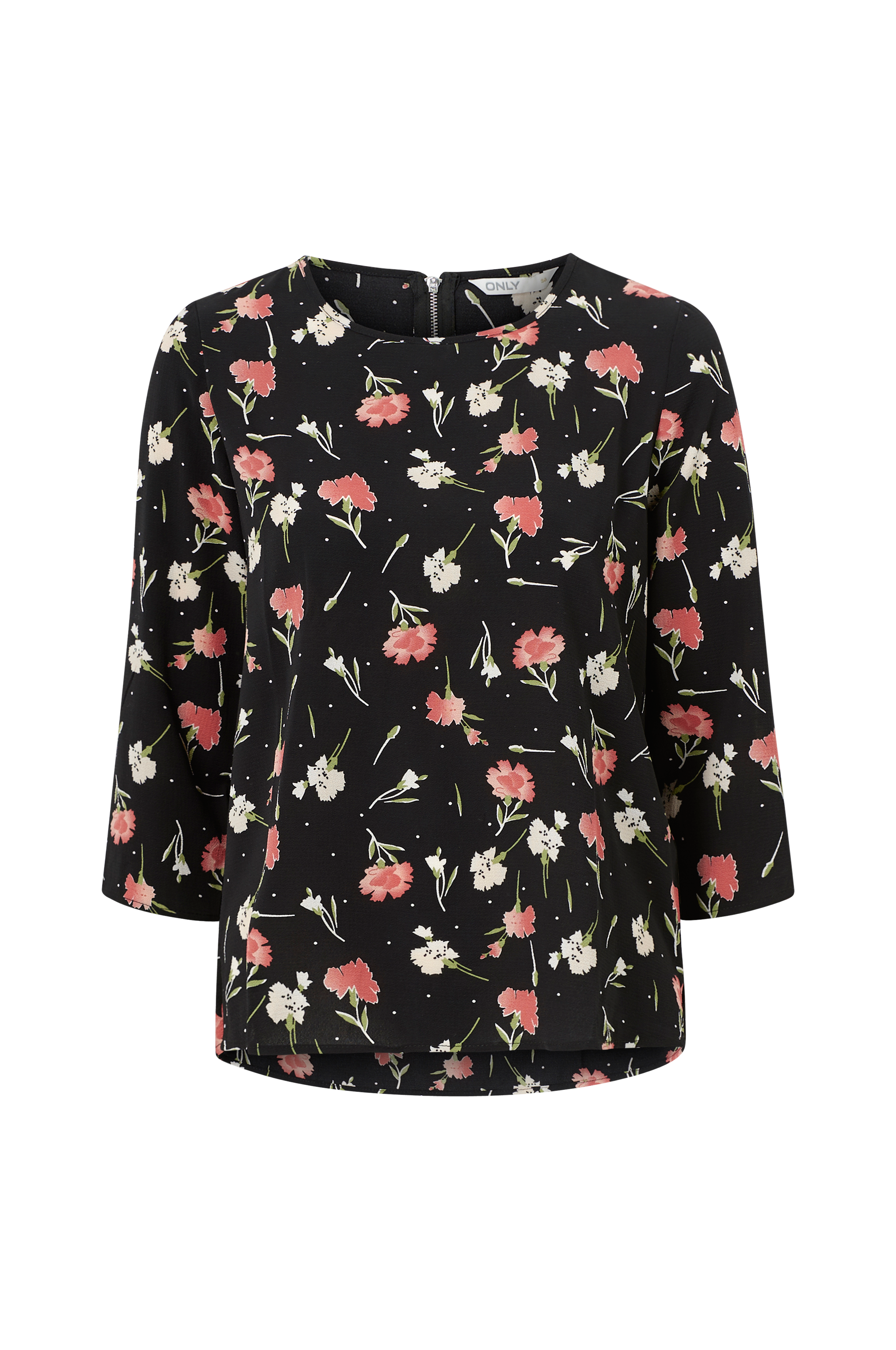 Top i vævet crepekvalitet med lige, 3/4-langt ærme. Rund hals med lille, påsyet kant og synlig lynlås i nakken.