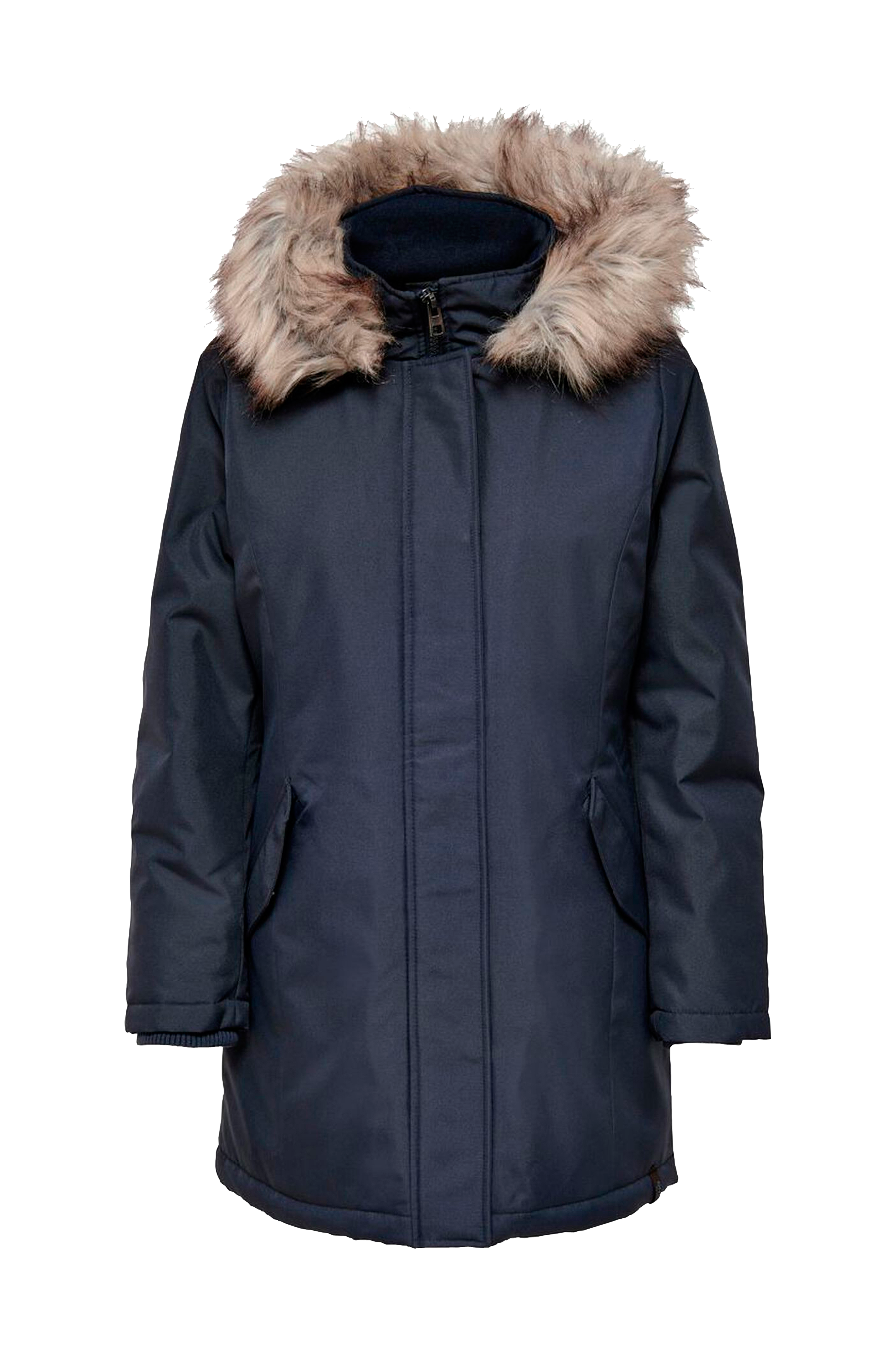 Parkacoat onlKaty Parka Coat fra Only. Lidt længere, vatteret model med quiltet for og knapkant med skjult lynlås og trykknapper samt høj krave. Hætte med aftagelig kant af kunstpels og blød, ribstrikket ærmekant. To store lommer med klap. Længde ca. 87 cm i str. M.