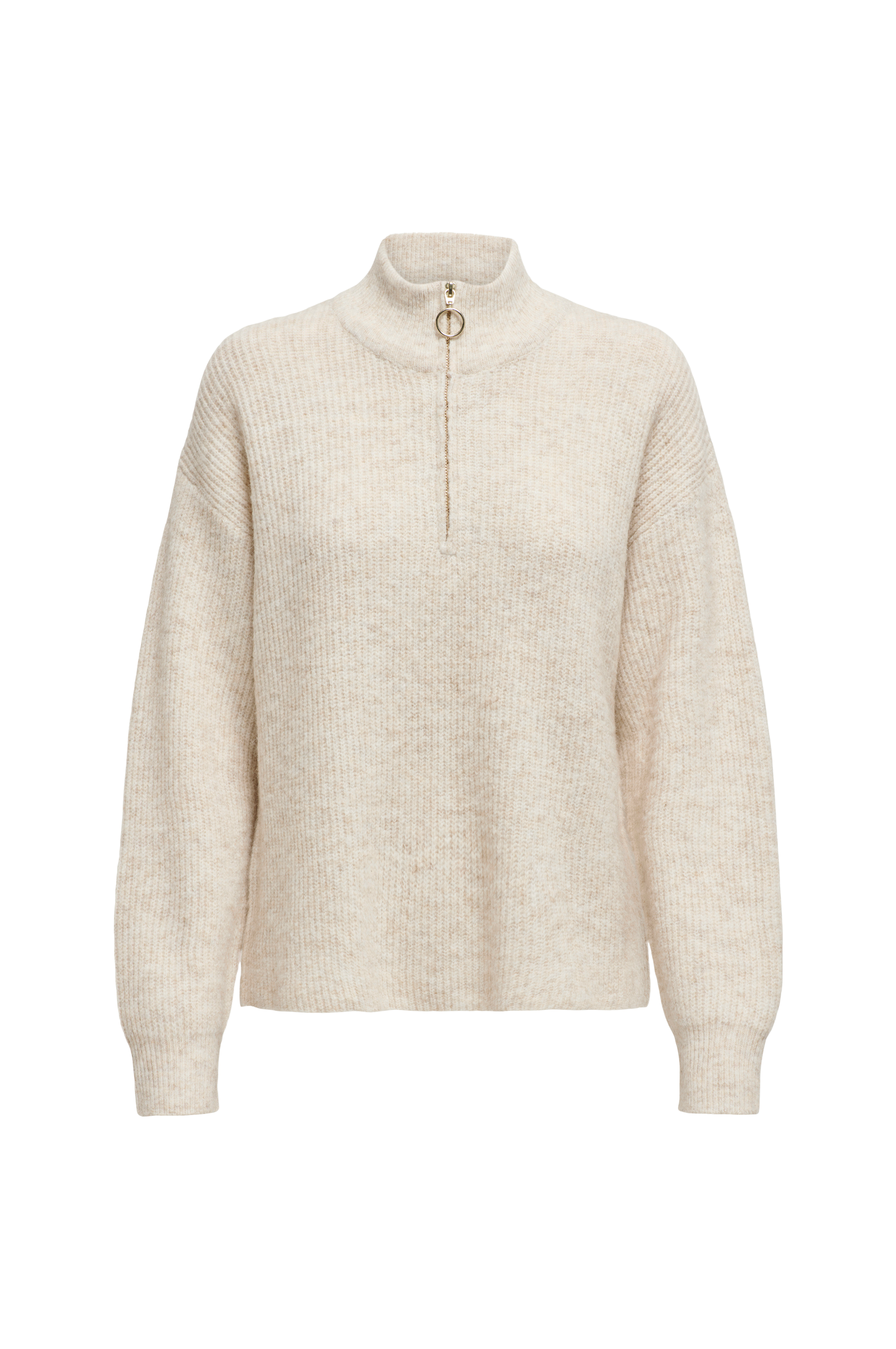 • Fintstrikket Pullover med høj, ribbet krave• Halvlang lynlås oppe foran• Lange ærmer med nedsænkede skuldre og ribmanchetter ved manchetterne