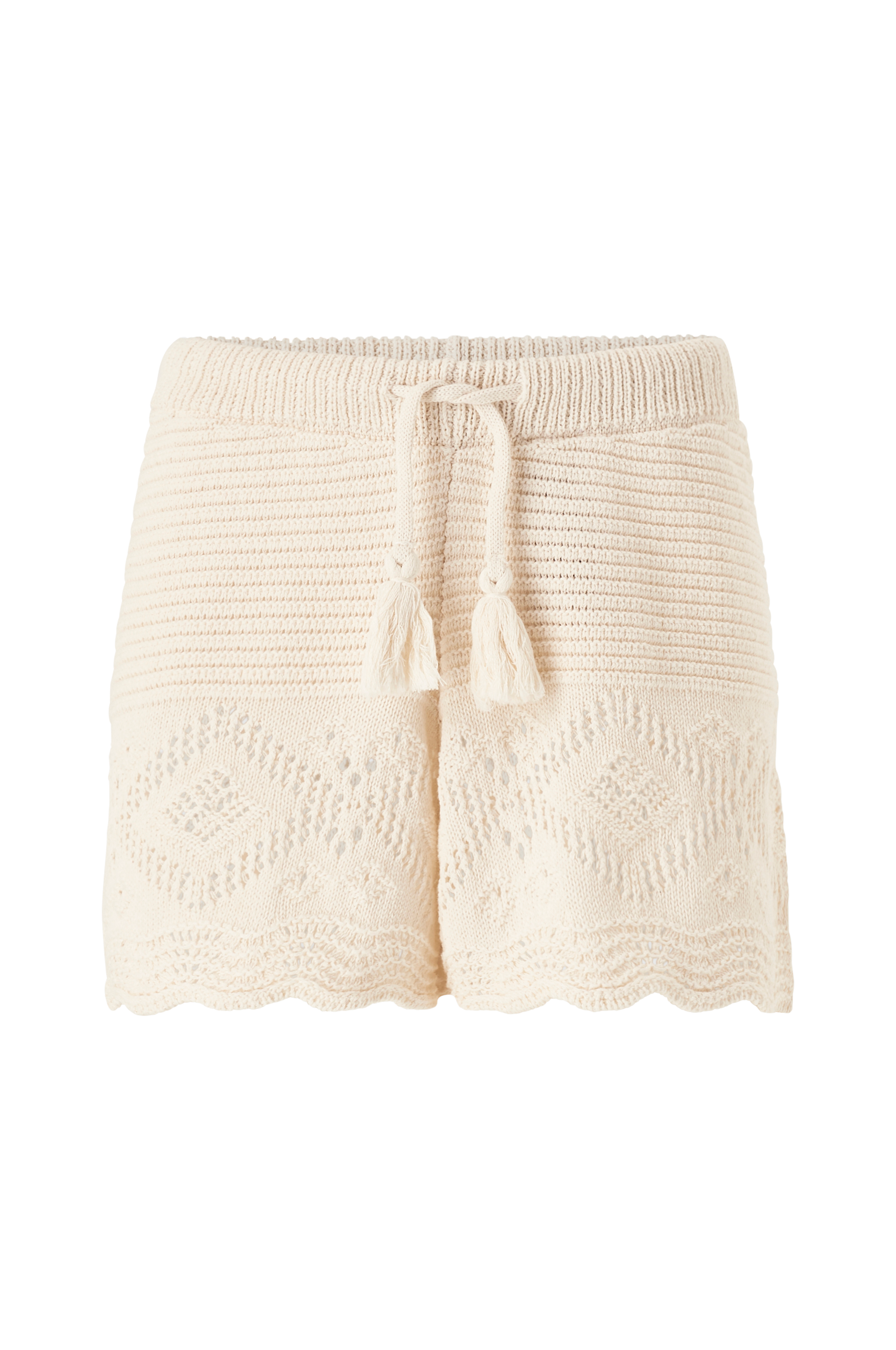 • Strikkede shorts• Ribbet, elastisk talje• Træksnørre med kvaster• Hulmønster nederst