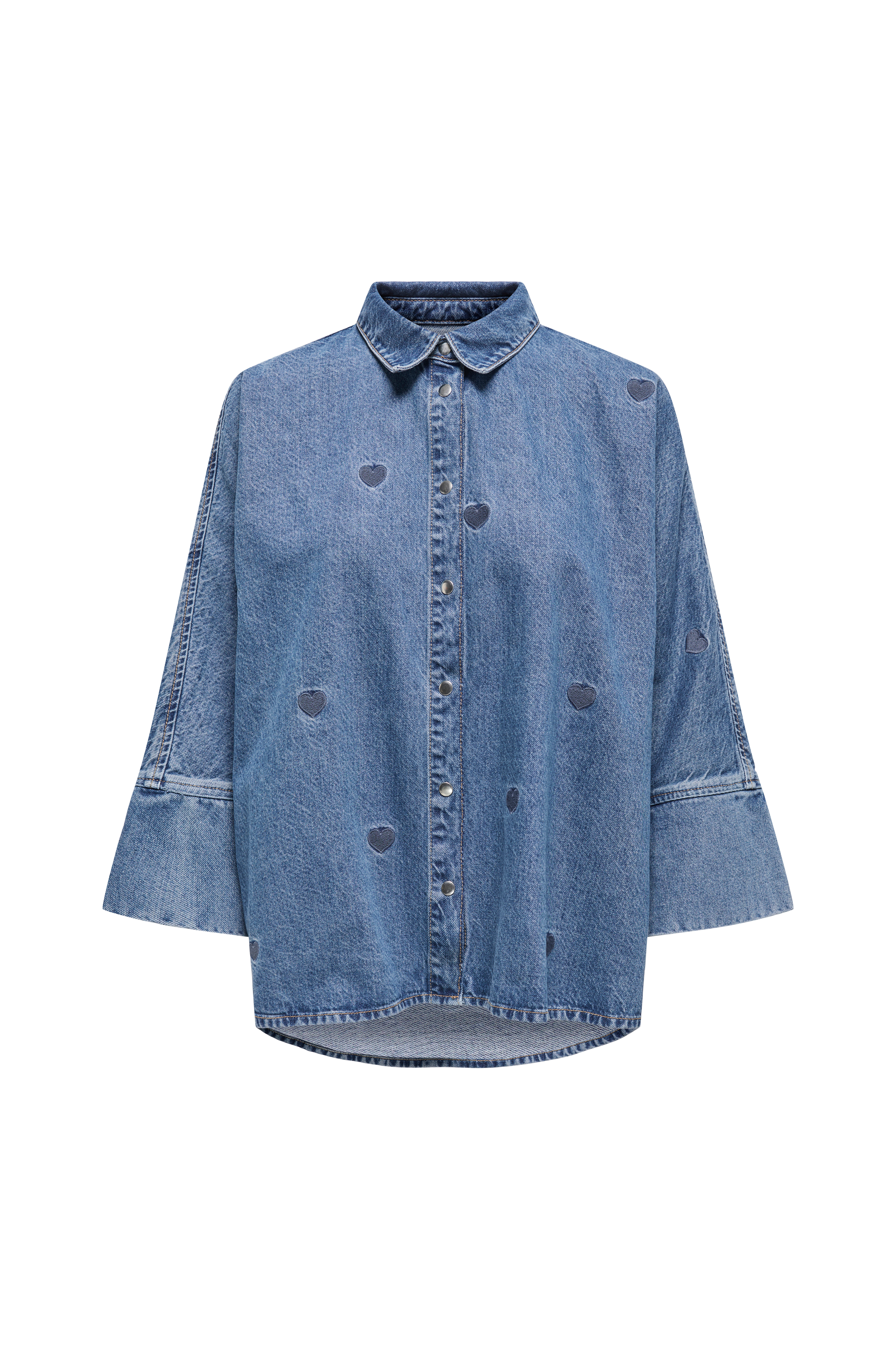 • Lige oversize model med broderede hjerter overalt• Trykknapper foran• Kimonoærme med bredt indlæg ved ærmeafslutningerne• Afrundet, lang søm bagpå