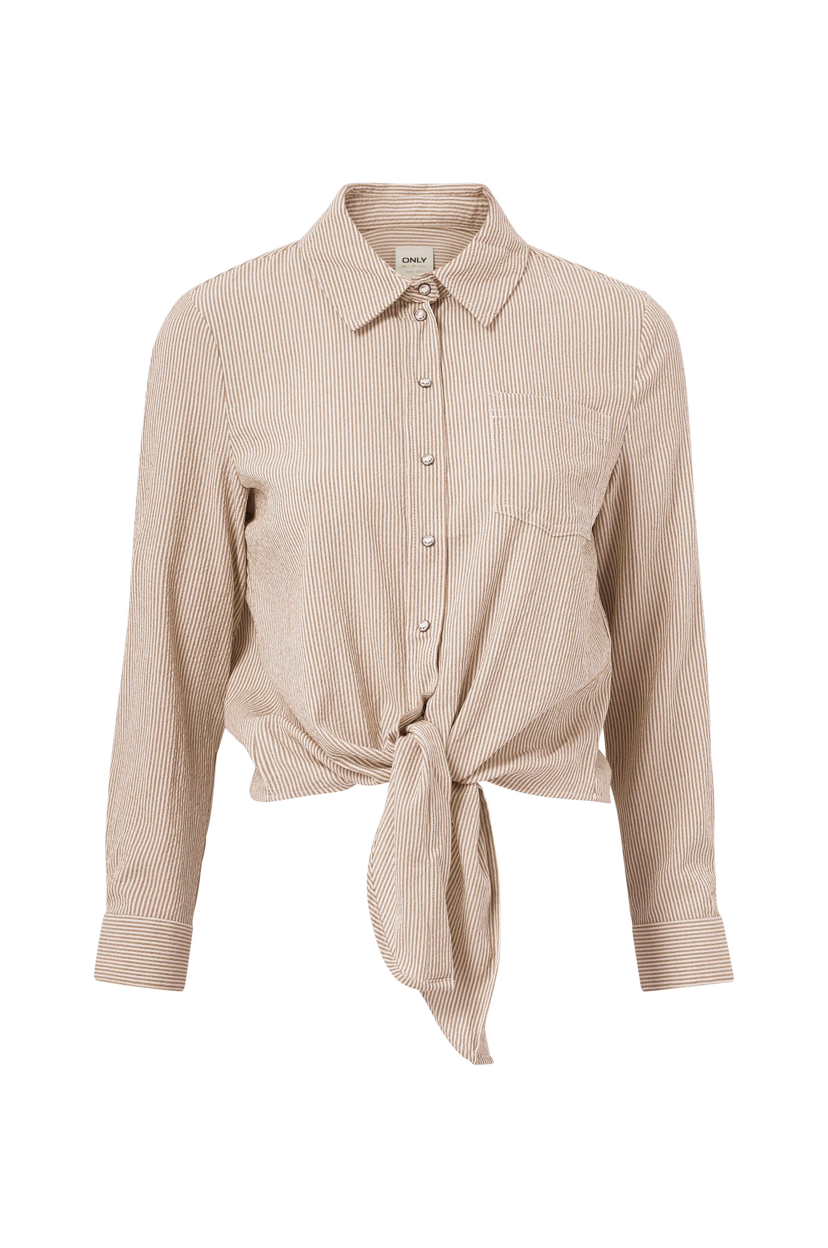 Stribet skjorte i vævet viskoseblanding med let look. Trykknapper foran og bindebånd forneden. Lange ærmer med manchet og trykknap i ærmekanterne.