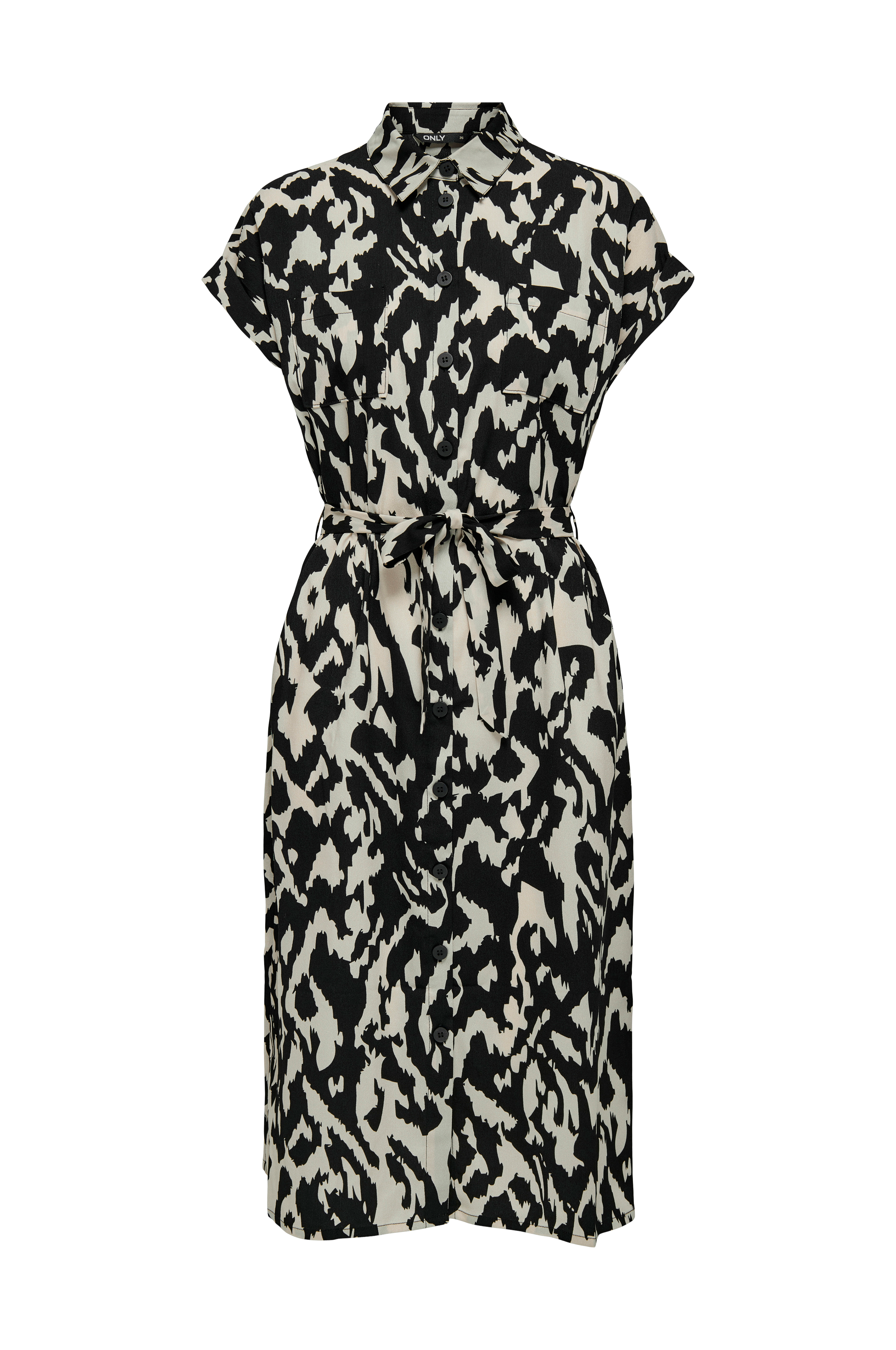 Skjortekjole onlHannover S/S Shirt Dress fra Only med knapper foran, to brystlommer og bindebælte i taljen. Korte, vide ærmer med opslag. Længde ca. 112 cm i str. 36.