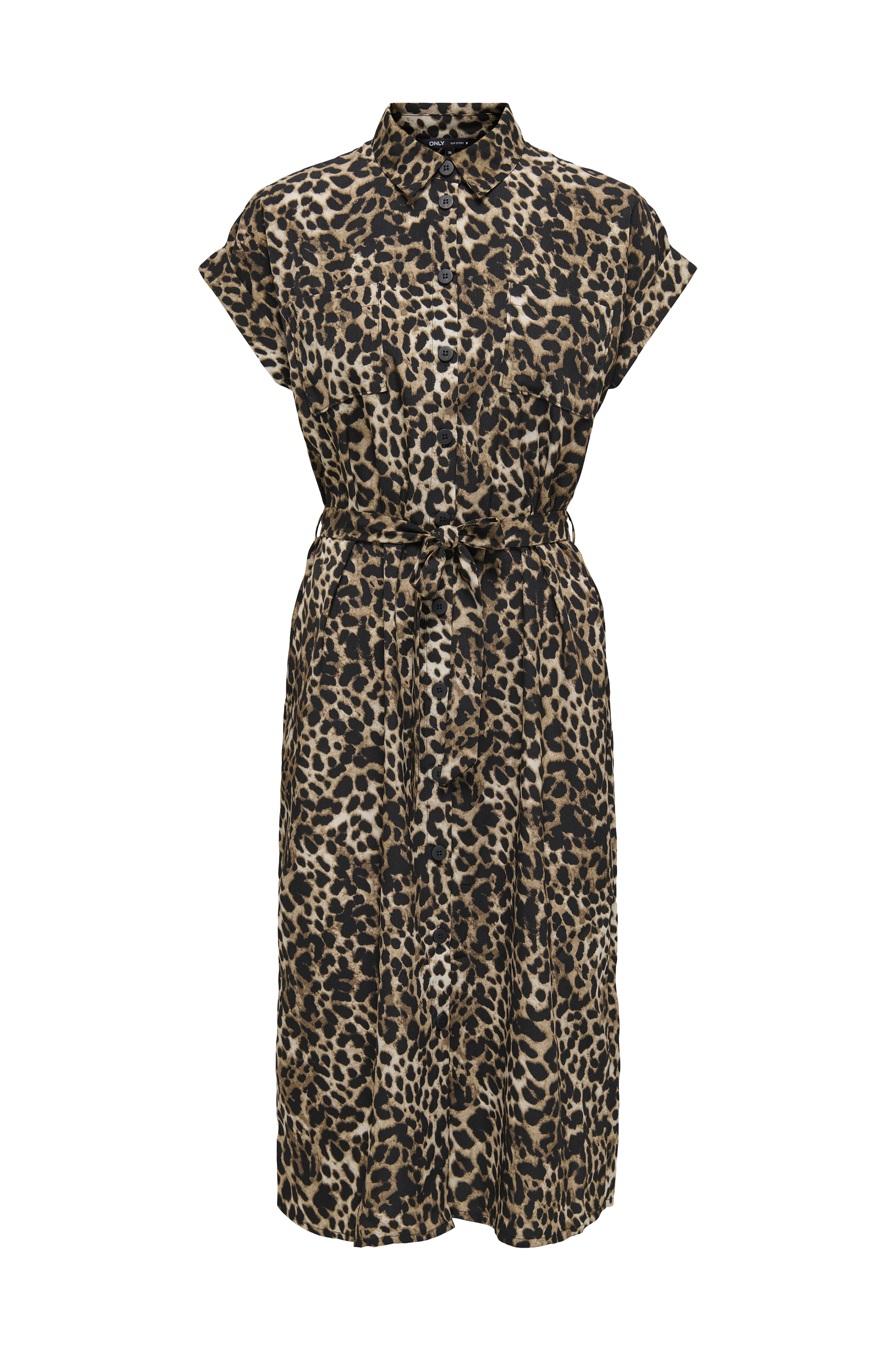 Skjortekjole onlHannover S/S Shirt Dress fra Only med knapper foran, to brystlommer og bindebælte i taljen. Korte, vide ærmer med opslag. Længde ca. 112 cm i str. 36.