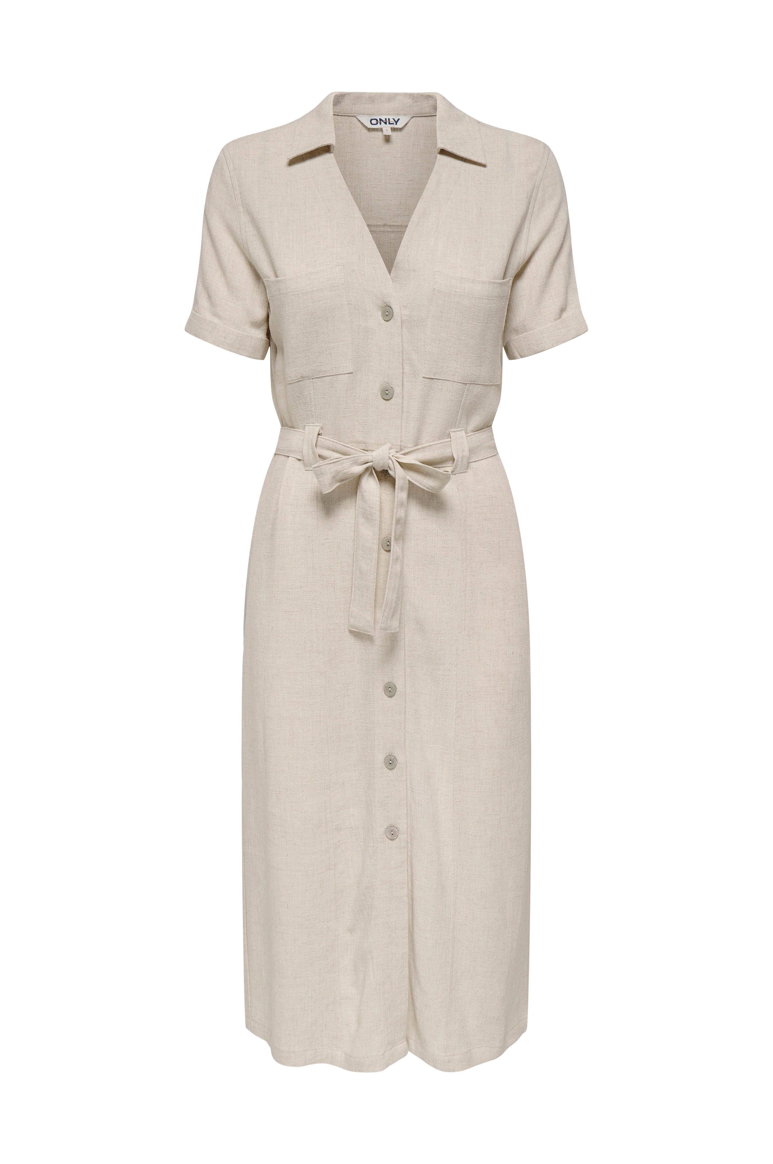 • Model i hørblanding • Krave • V-udskæring • Knapper hele vejen frem • Kort ærme med fæstet oprullet • Brystlommer • Stropper med bindebælte • Længde: 115 cm i størrelse S