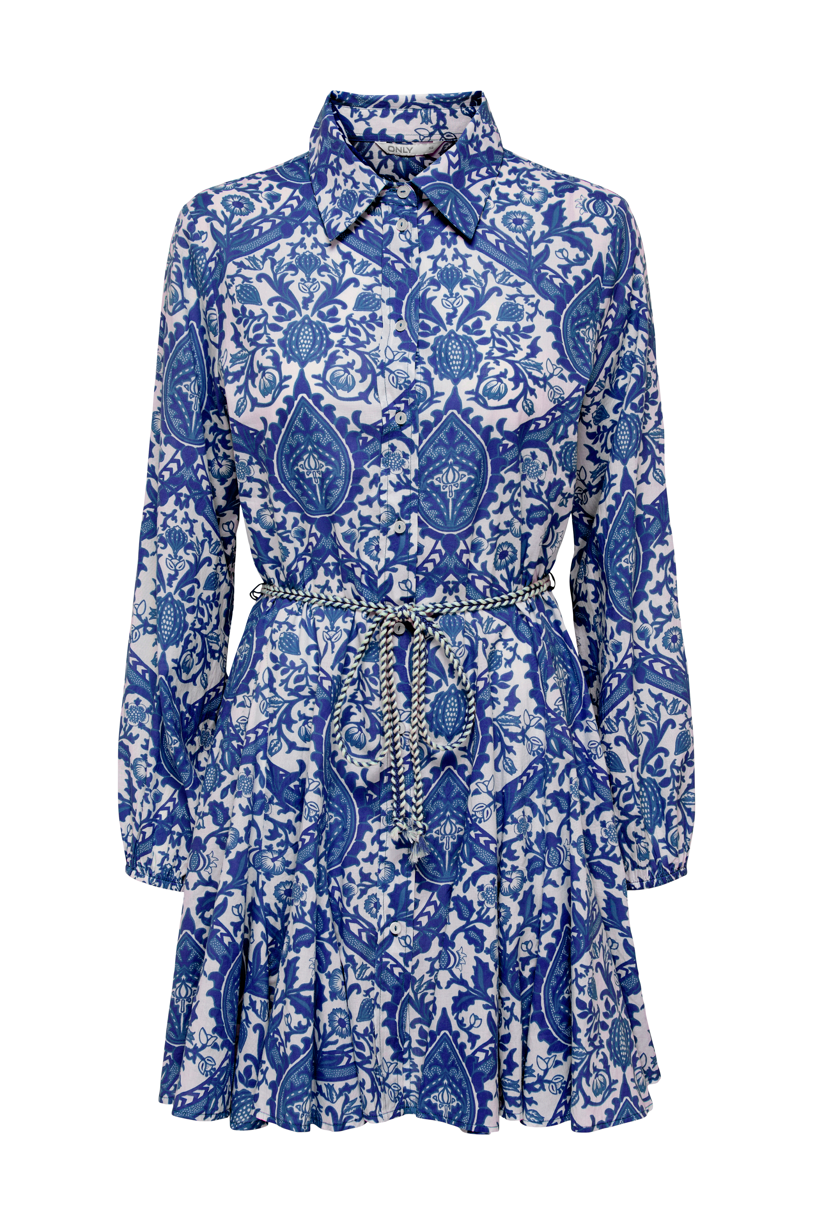 • Figurformede model med ekstra bred nederdel• Lille krave• Syet knaplukning foran foran• Langt ærme med elastik ved manchetterne• Bindebælte ved taljen• Længde: 88 cm i størrelse S