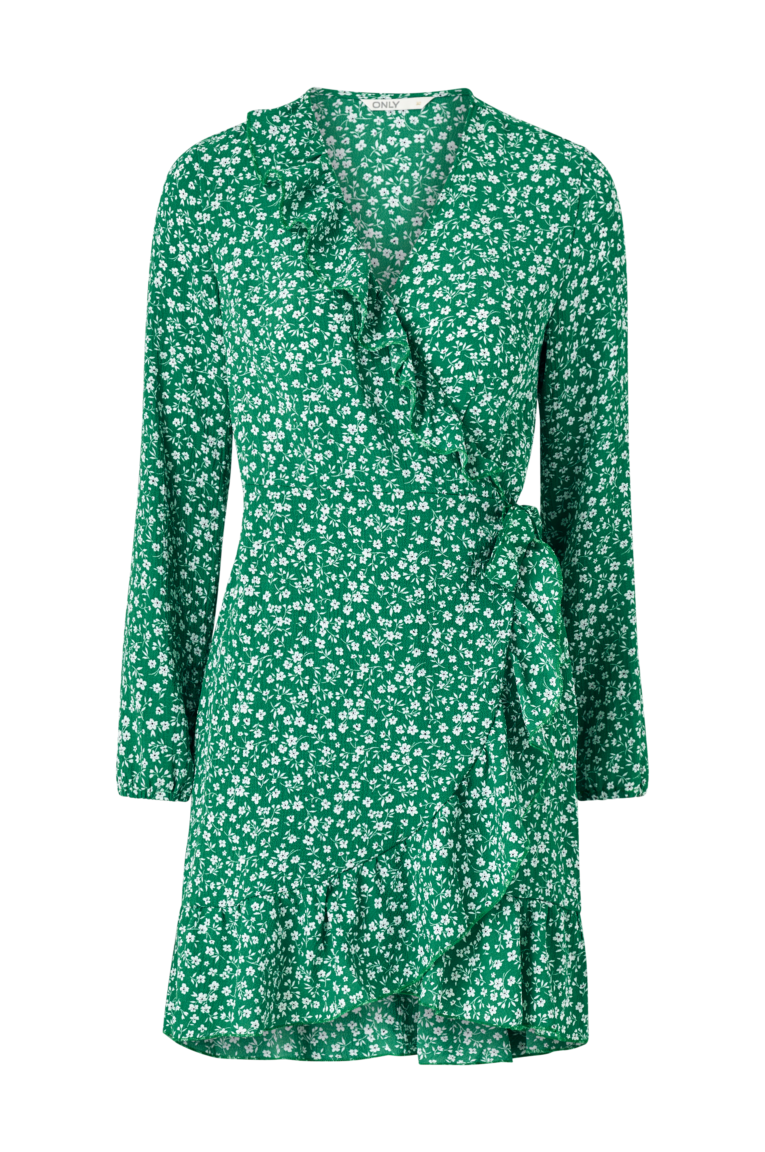 Slå om-kjole onlCarly L/S Wrap Short Dress fra Only. Åben slå om-model med påsyet flæse langs forkant og forneden. Langt ærme med indsat elastik i taljen og afskæring med bindebånd i taljen. Længde bagpå ca. 89 cm i str. 36.