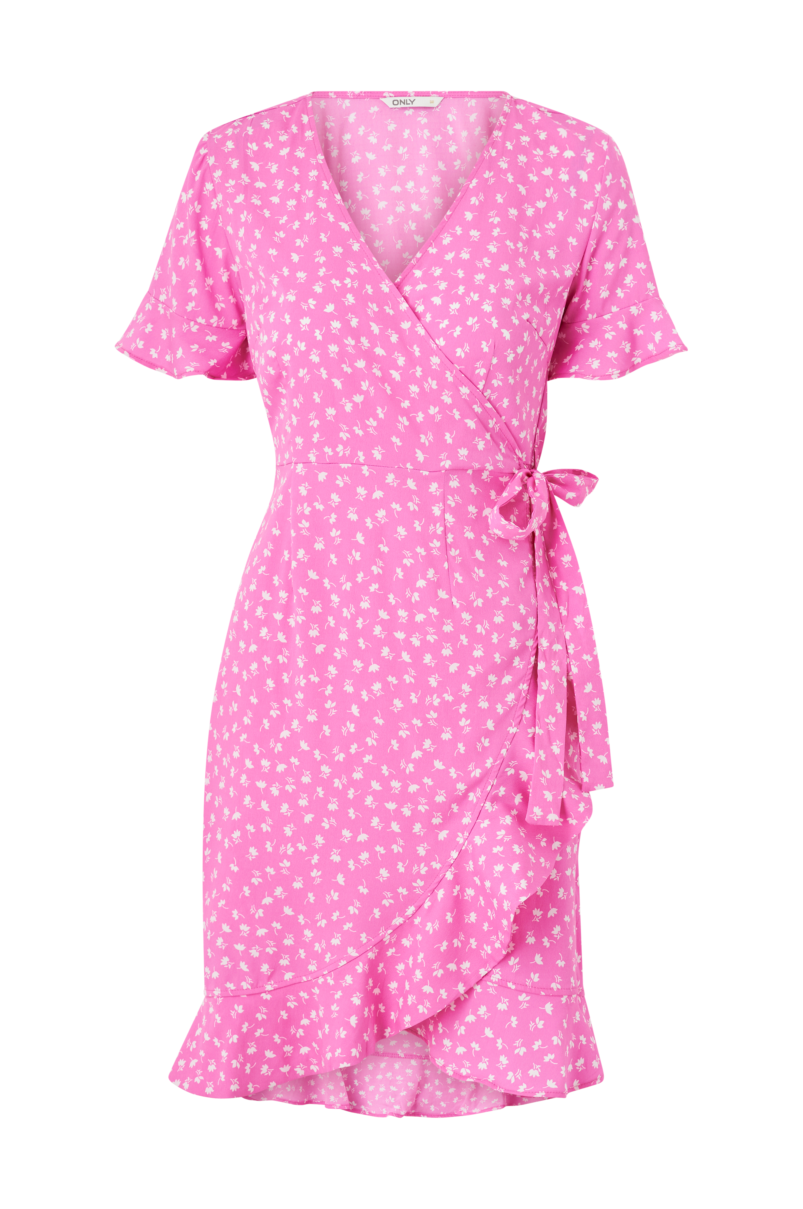 Slå om-kjole onlOlivia S/S Wrap Dress Wvn fra Only med korte flæseærmer og flæse langs nederdelens kant forneden. Bindebånd i siden. Længde ca. 96 cm i str. 36.