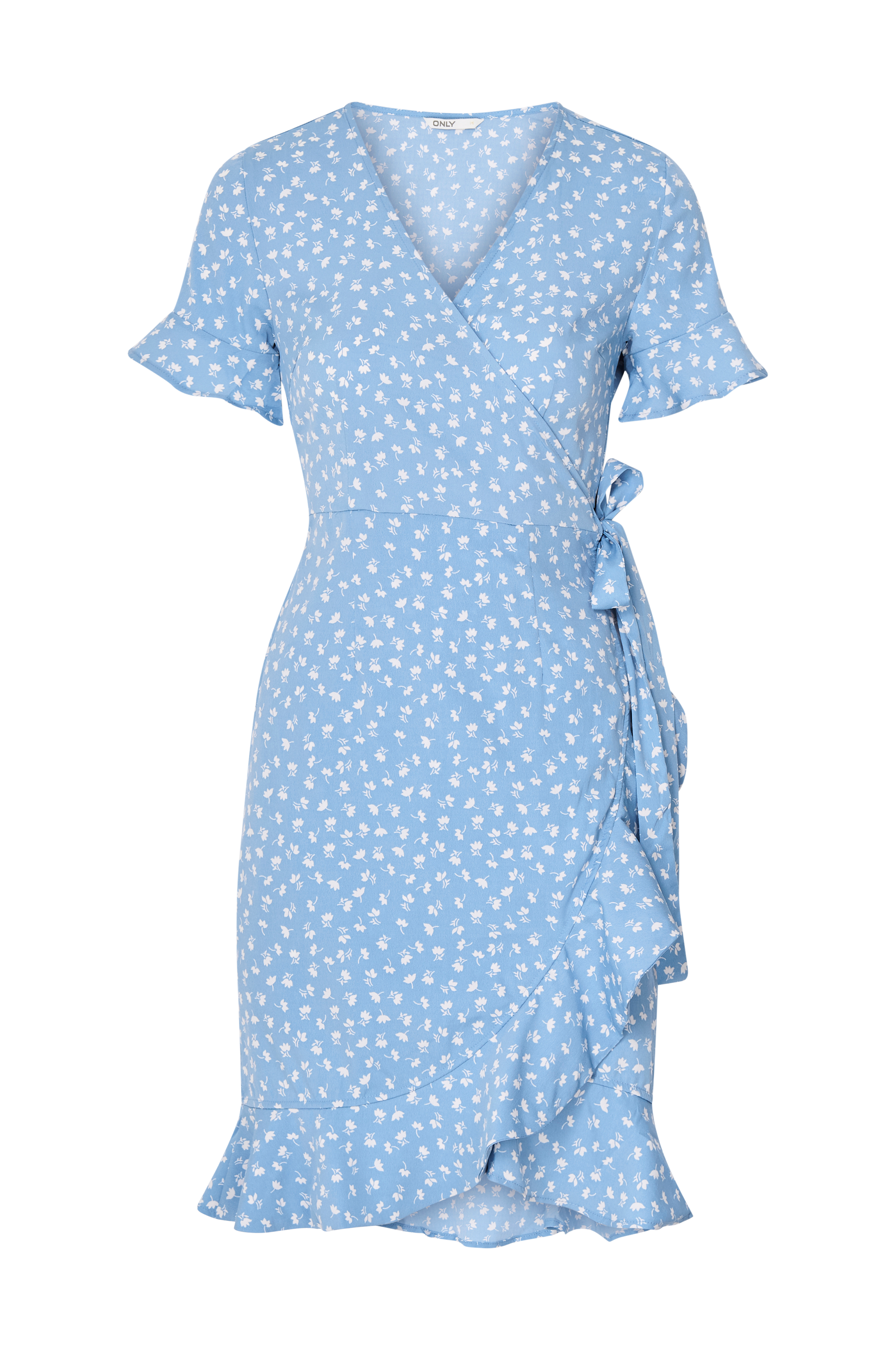 Slå om-kjole onlOlivia S/S Wrap Dress Wvn fra Only med korte flæseærmer og flæse langs nederdelens kant forneden. Bindebånd i siden. Længde ca. 96 cm i str. 36.