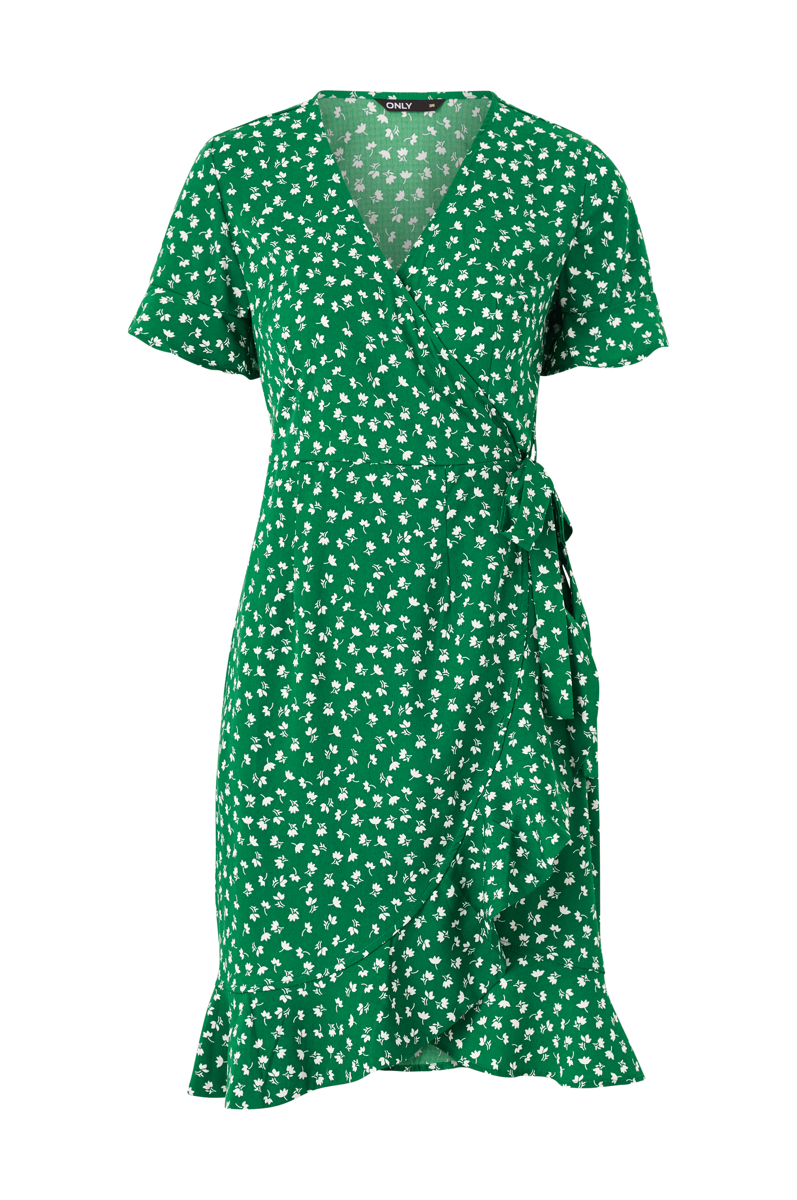 Slå om-kjole onlOlivia S/S Wrap Dress Wvn fra Only med korte flæseærmer og flæse langs nederdelens kant forneden. Bindebånd i siden. Længde ca. 96 cm i str. 36.