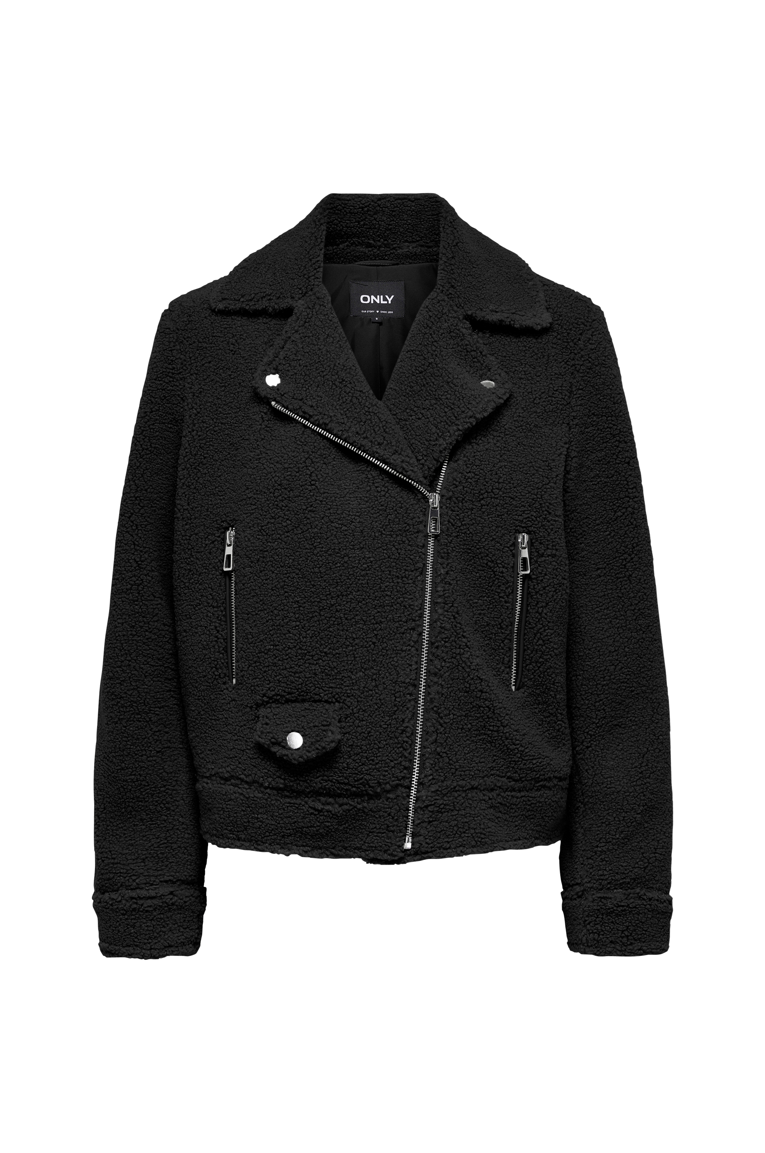 • Jakke i teddy• Detaljer i imiteret læder• Bikermodel med skråt stillet lynlås• To lommer med lynlås• Længde: 55 cm i størrelse S