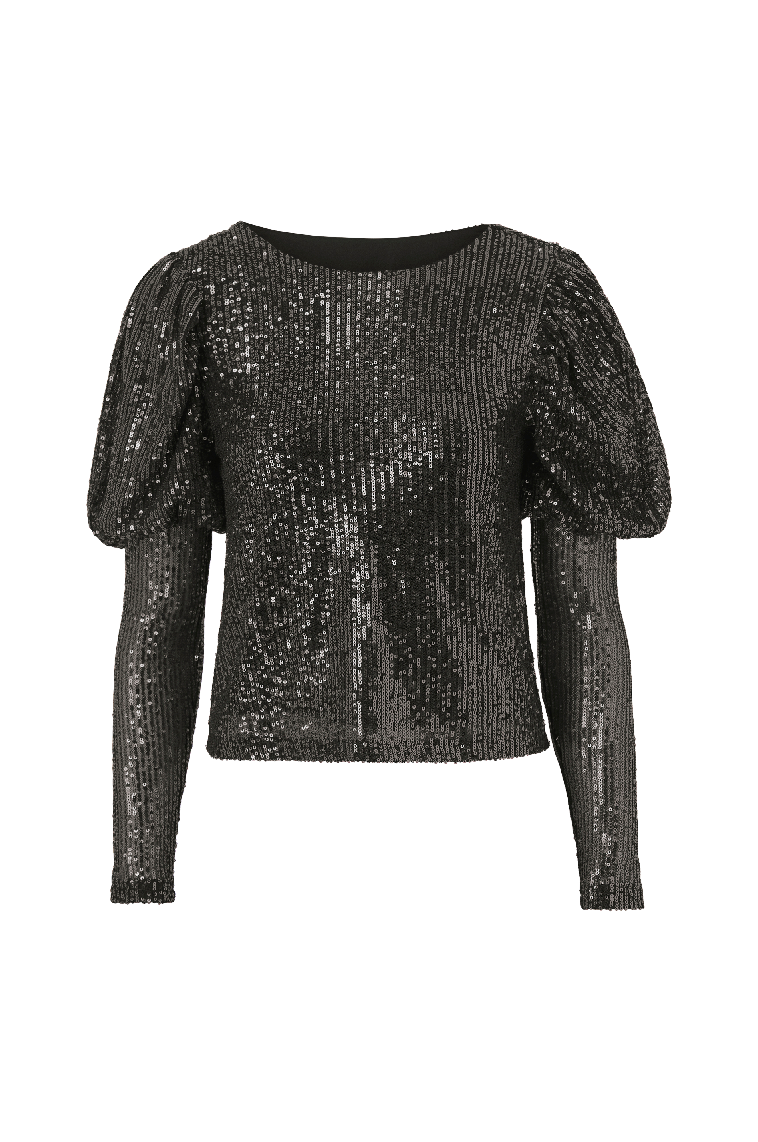 Top onlBae L/S Glitter Top fra Only. Lige model i mesh med broderede pailletter over det hele. Rund hals med dyb udskæring i ryggen. Kort pufærme med rynkning ved skulderen og langt, smalt ærme under.