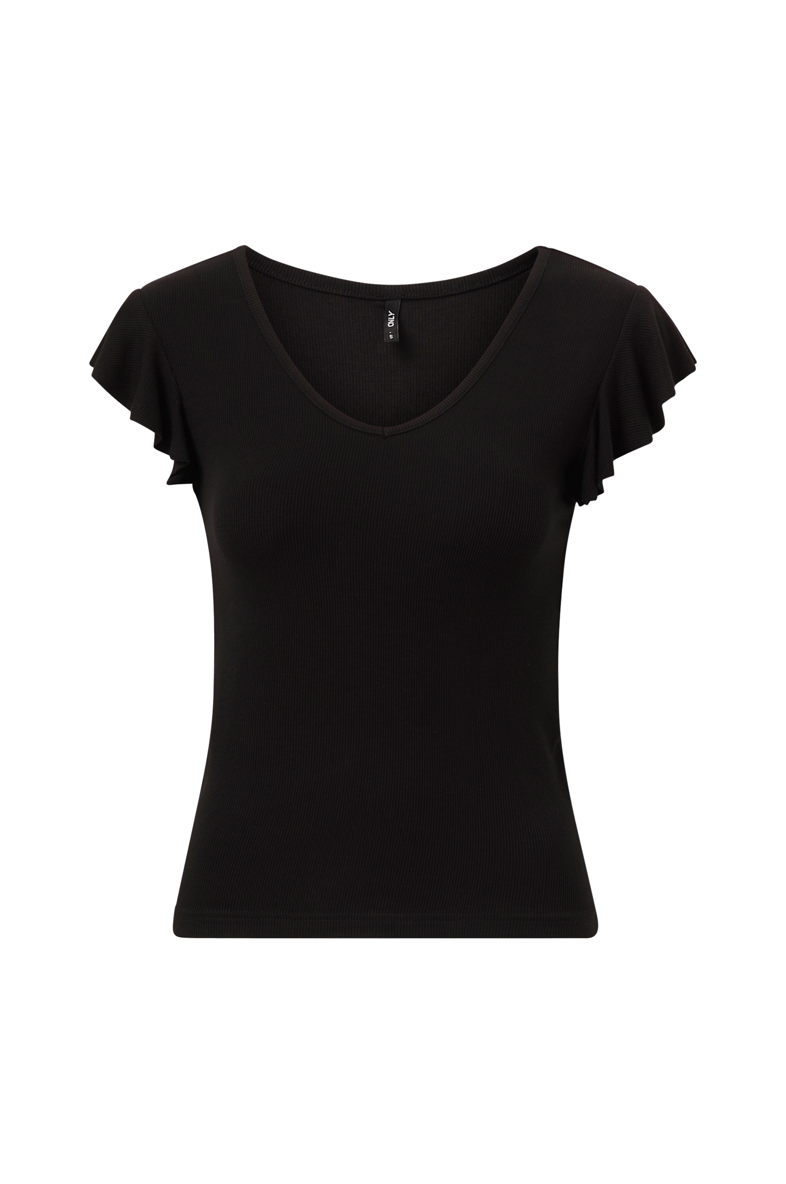 • Ribbet top• V-udskæring• Korte flagrende ærmer• Smal pasform
