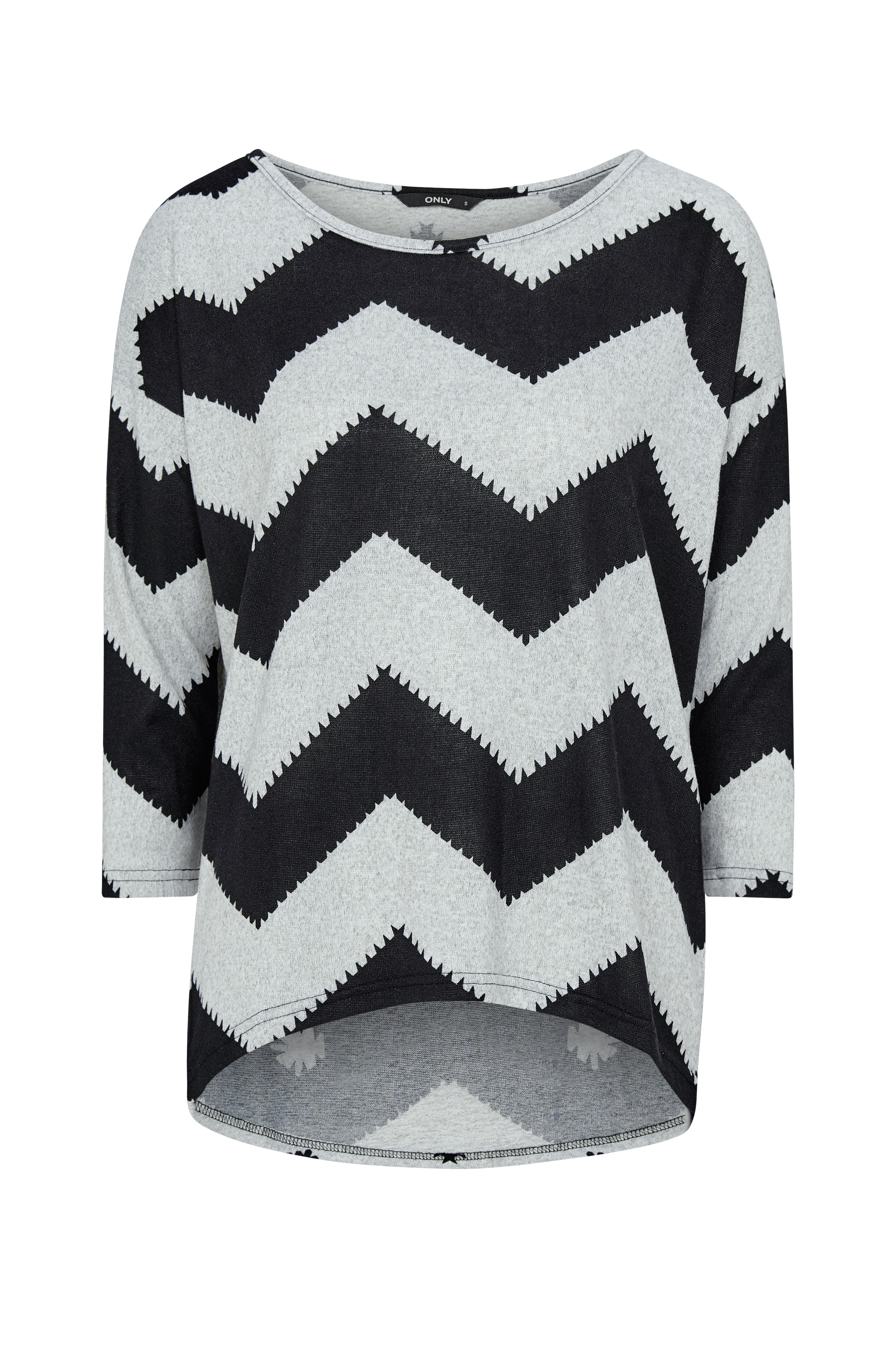 Top onlElcos Top fra Only. Blød, fintstrikket model med skøn vidde og lavere skuldersømme med 3/4-langt ærme. Vid halsudskæring med påsyet kant og afrundet kant forneden som er længere bagpå. Længde foran ca. 64 cm og bagpå ca. 75 cm i str. S.