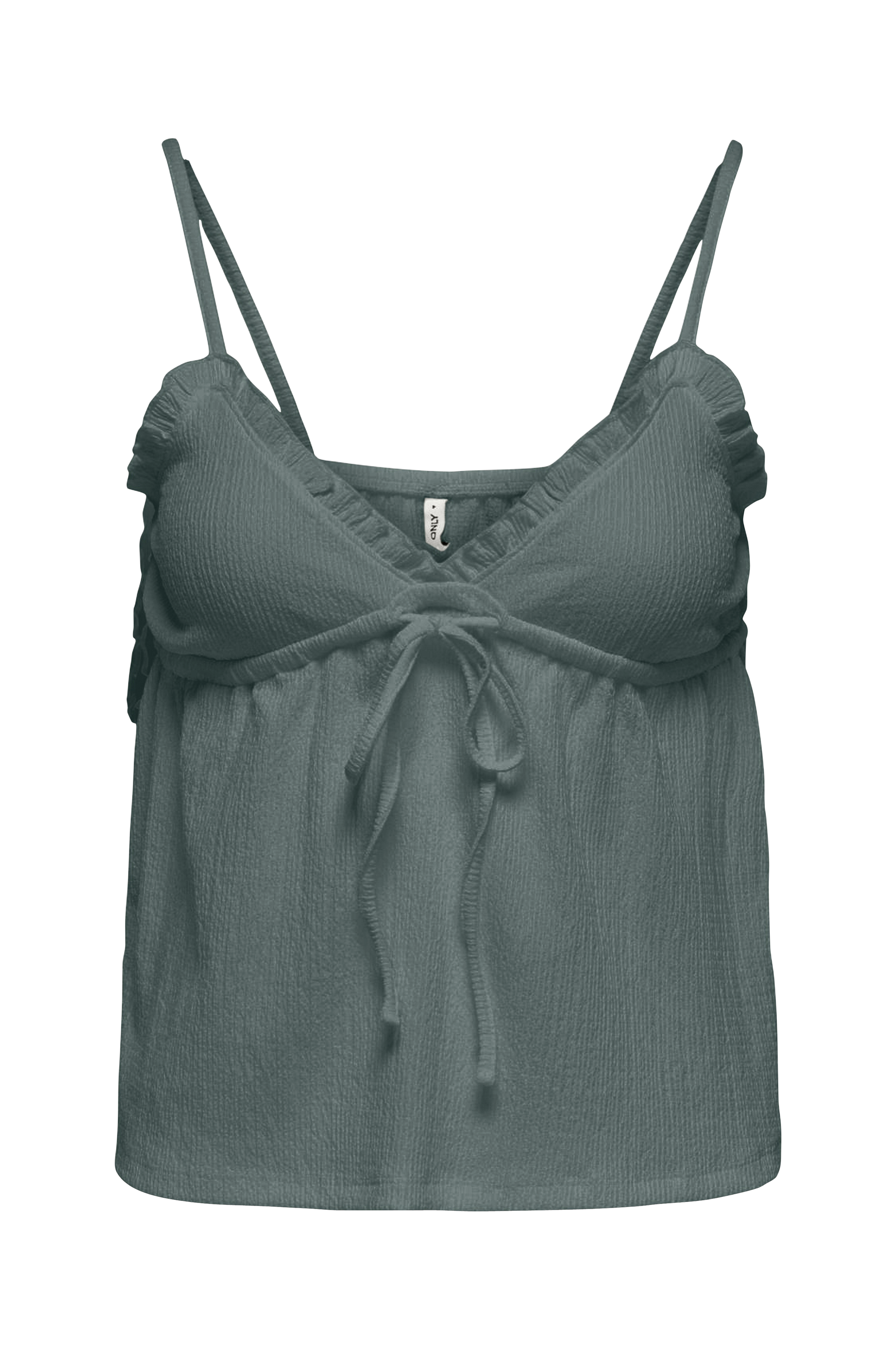 • Ærmeløs model med træksnørre under brystet• Tynde skulderstropper• Lille flæsekant på toppen• Indlagt elastik oppe bagved