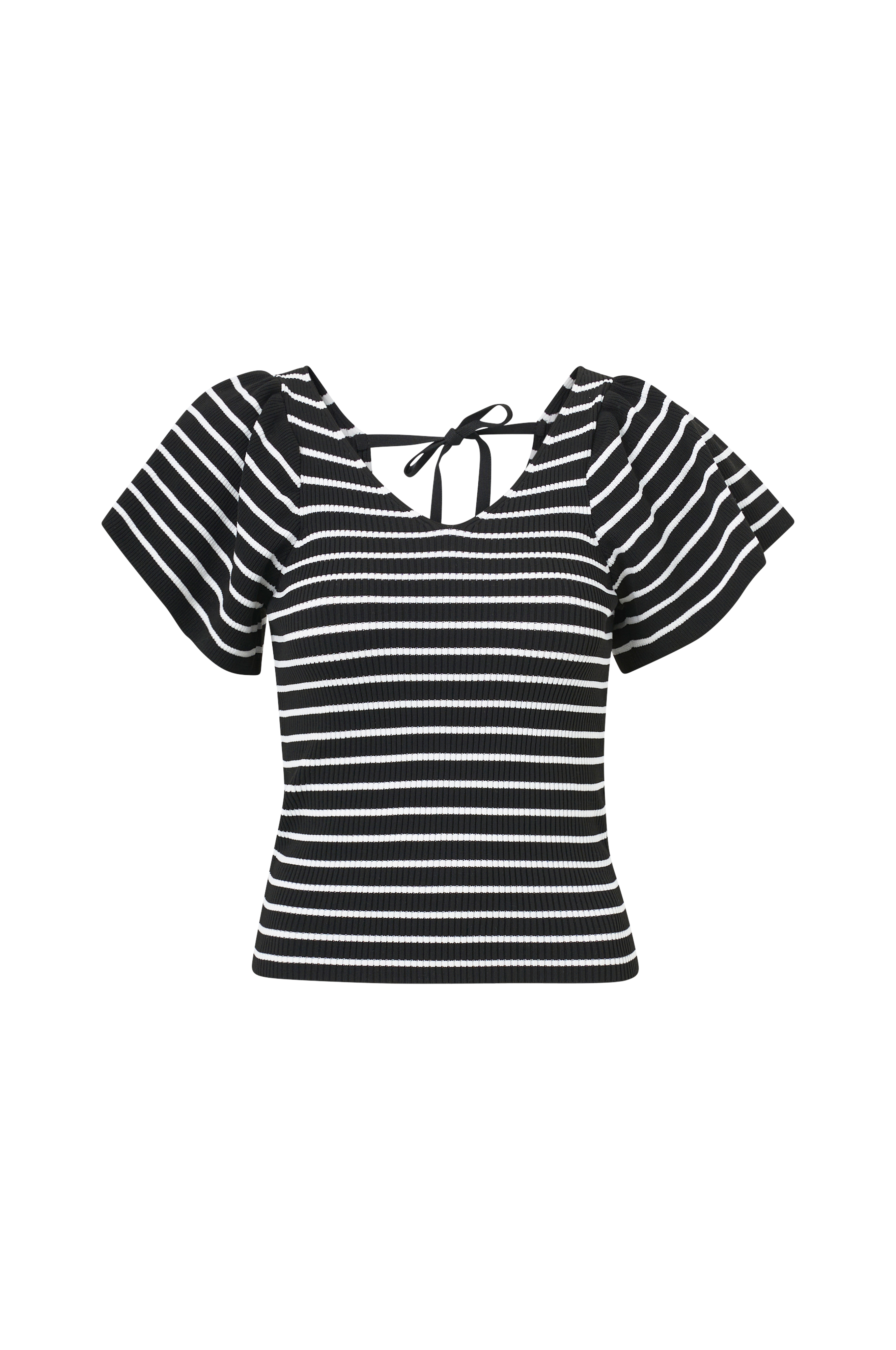 • Korte, brede sommerfugleærmer• V-udskæring foran og bagpå• Bindebånd i nakken• Ribbet kvalitet