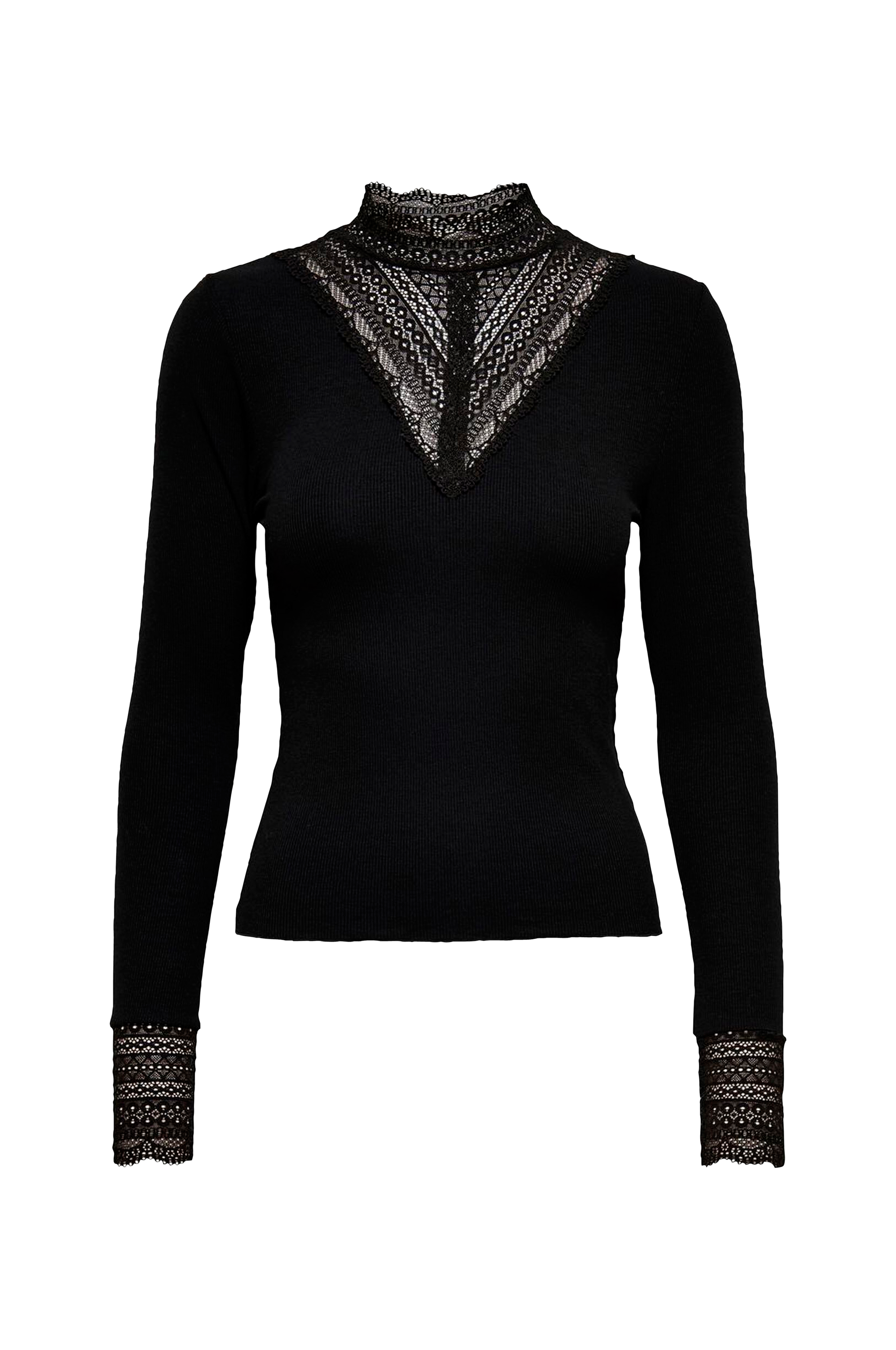 Top onlTilde L/S High Neck Lace Top fra Only i tynd jerseyrib med v-formet blonde foroven. Langærmet model med standkrave og blonde i ærmekant.