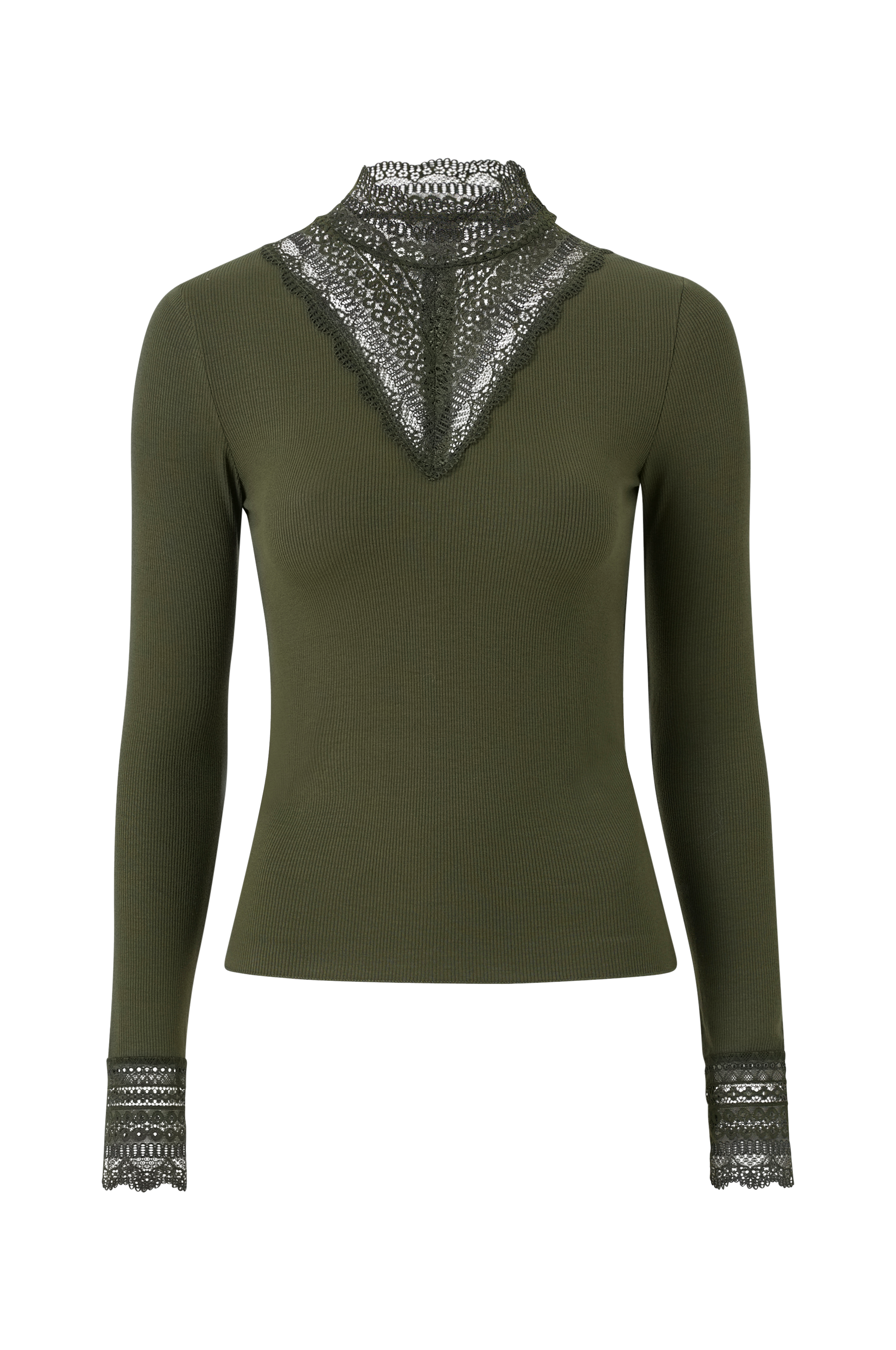 Top onlTilde L/S High Neck Lace Top fra Only i tynd jerseyrib med v-formet blonde foroven. Langærmet model med standkrave og blonde i ærmekant.