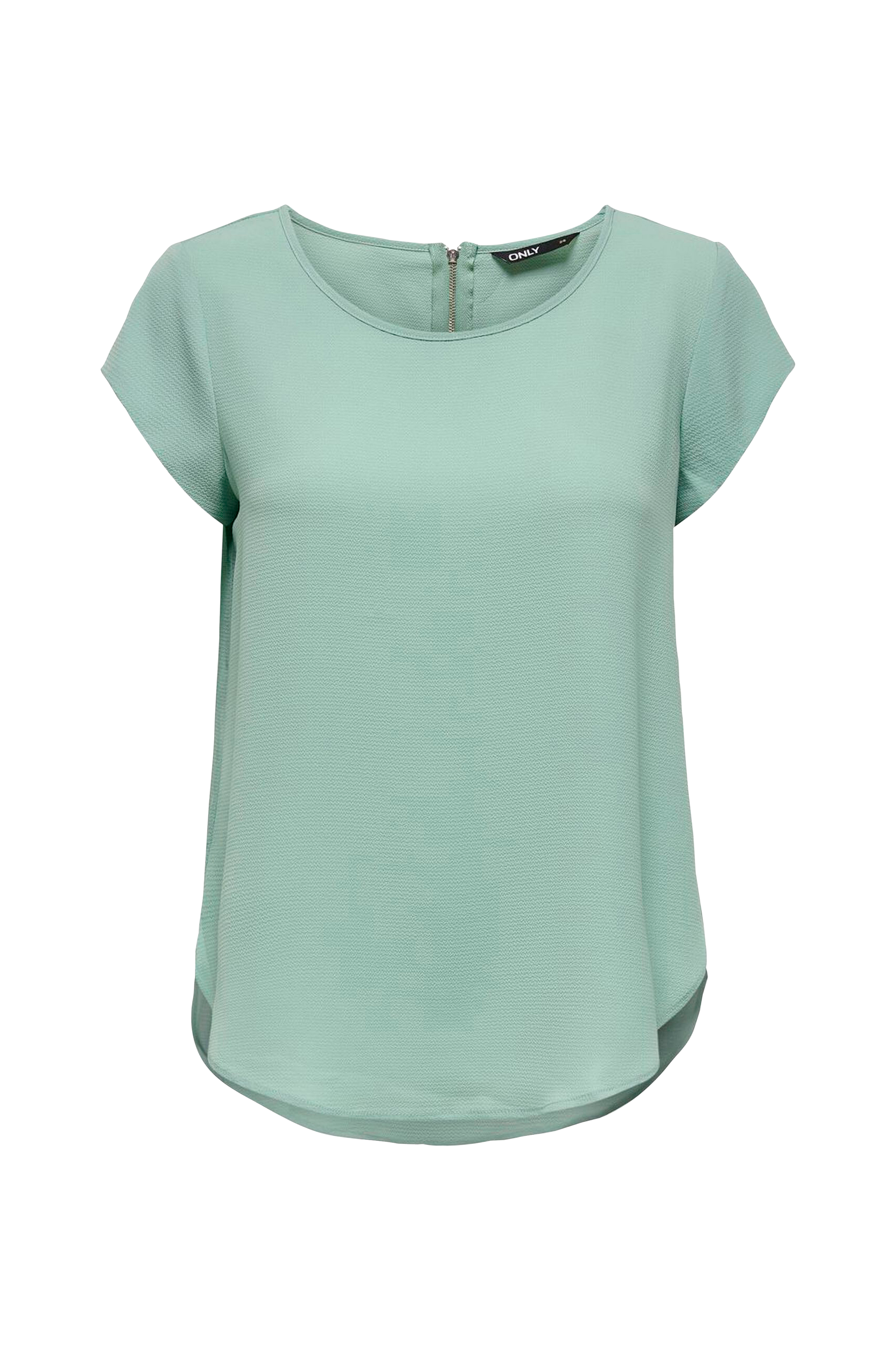 Top onlVic S/S Solid Top fra Only. Lige model med kort ærme og vid halsudskæring med smalt kantbånd og sølvfarvet lynlås i nakken. Afrundet kant forneden, som er længere bagpå. Vævet crepekvalitet med stretch. Længde foran ca. 62 cm og bagpå ca. 69 cm i str. 36.