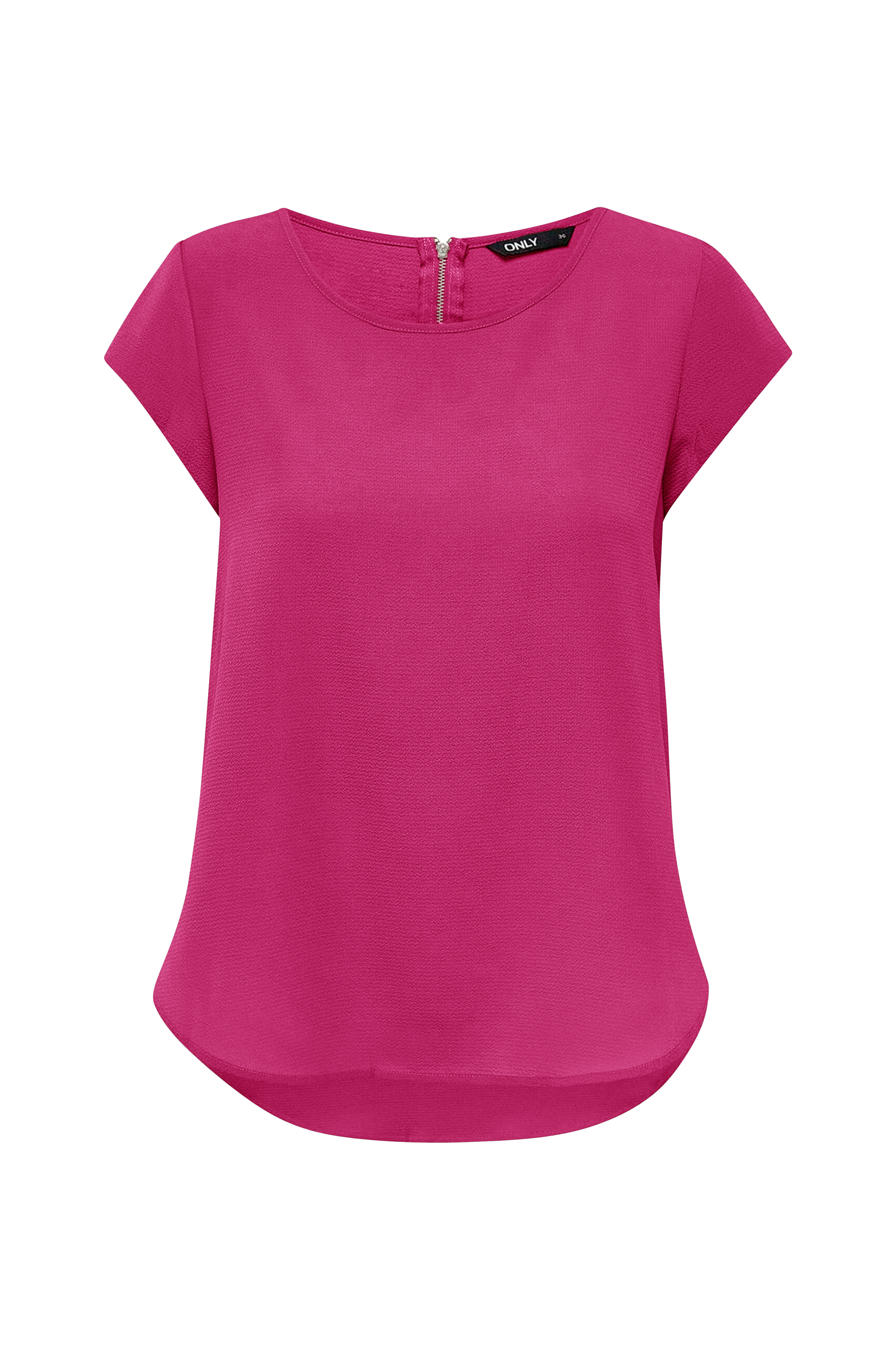 Top onlVic S/S Solid Top fra Only. Lige model med kort ærme og vid halsudskæring med smalt kantbånd og sølvfarvet lynlås i nakken. Afrundet kant forneden, som er længere bagpå. Vævet crepekvalitet med stretch. Længde foran ca. 62 cm og bagpå ca. 69 cm i str. 36.