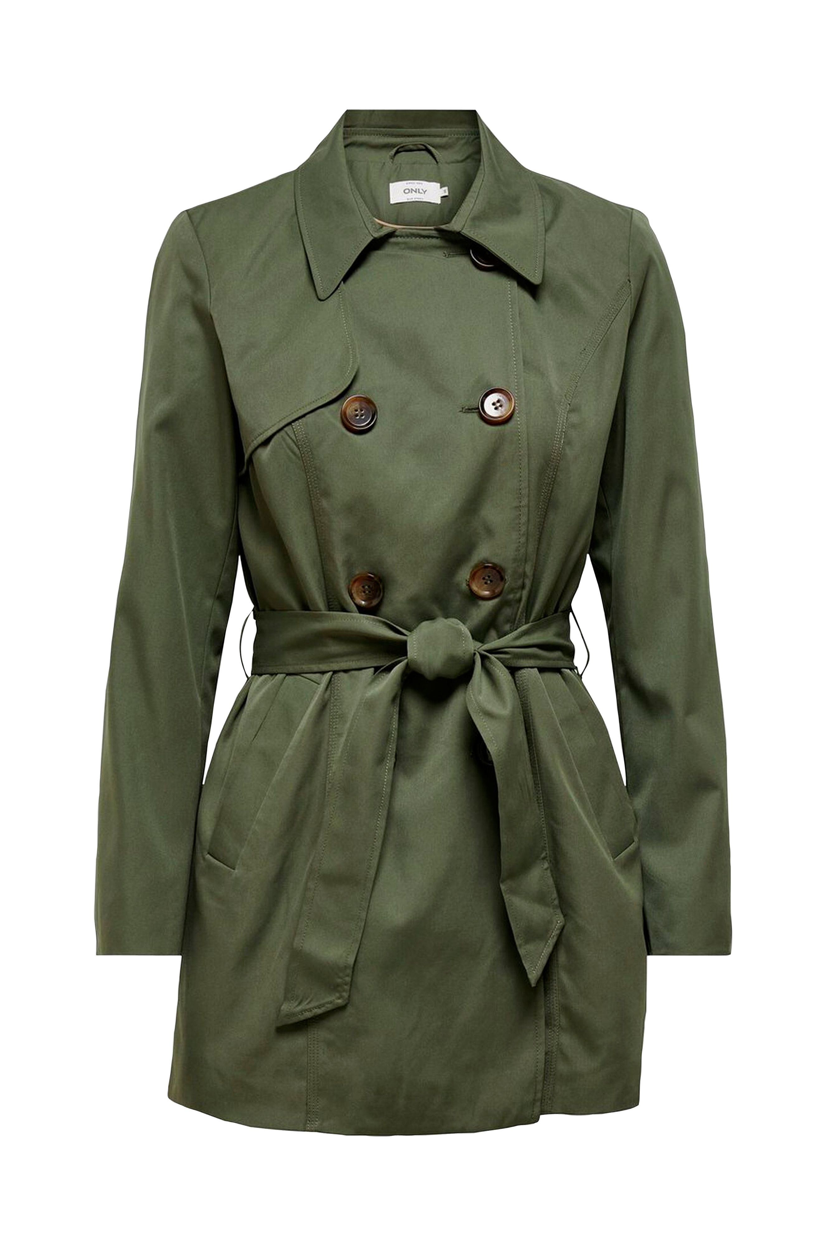Trenchcoat onlValerie fra Only. Dobbeltradet model med krave og pyntestukne delesømme foran og bagpå. To indsatte lommer og stropper med bindebælte i taljen. Vævet kvalitet med vævet for og tynde skulderpuder. Længde ca. 81 cm i str. S.