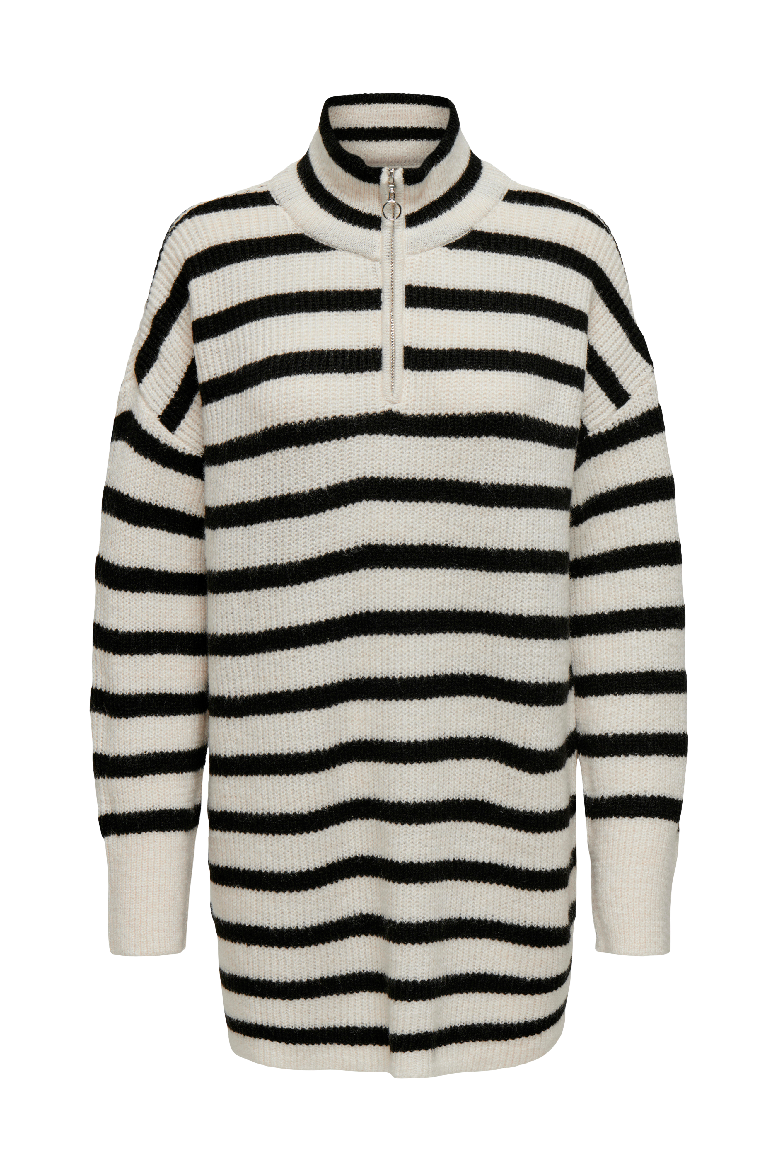 • Lang, stribet model• Høj krave med lynlås• Nedsænket skulder med ekstra langt ærme• Slids nede i siderne
