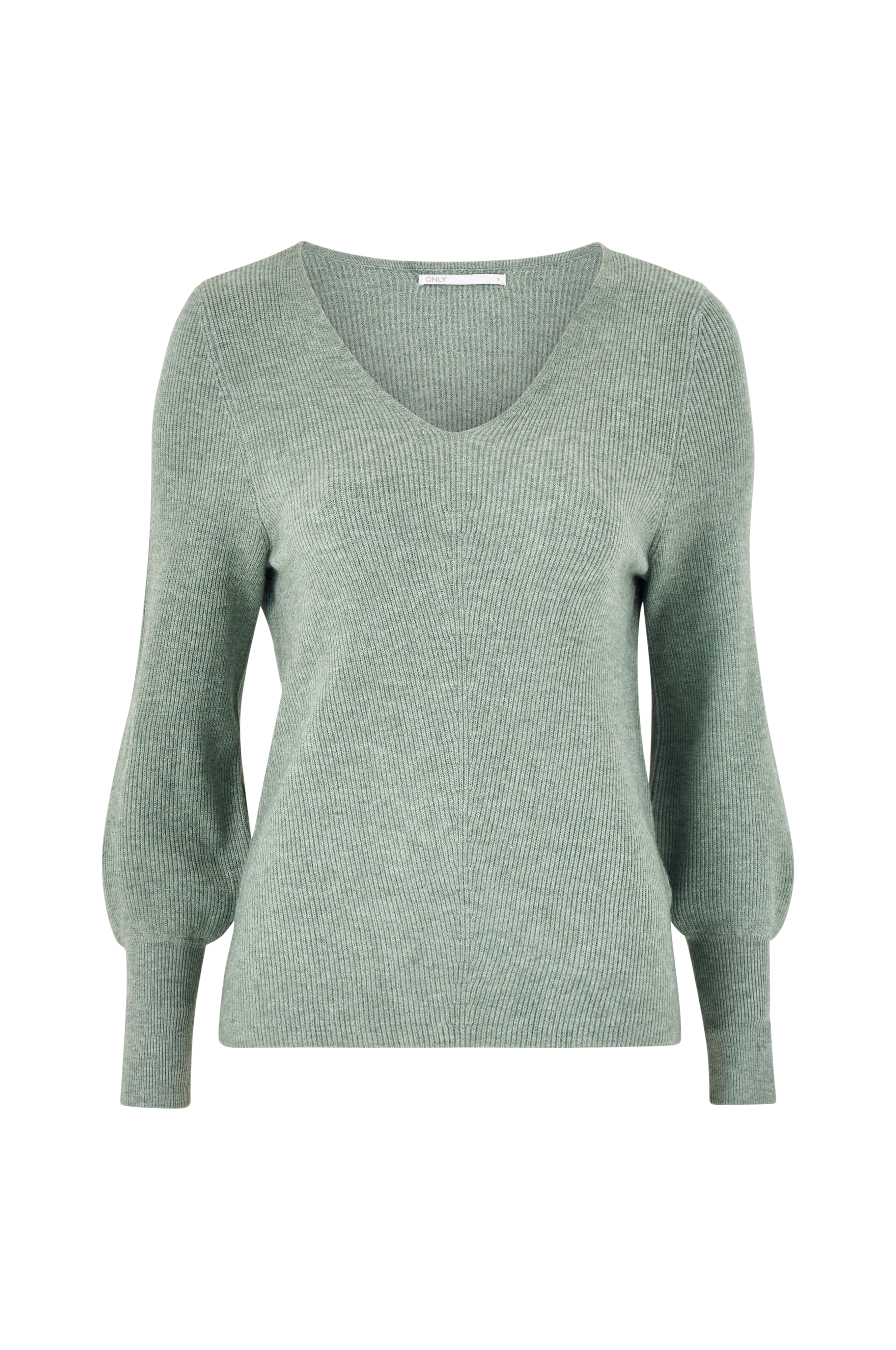 • Lige, ribstrikket model• V-formet halsudskæring• Langt ærme med bred manchet