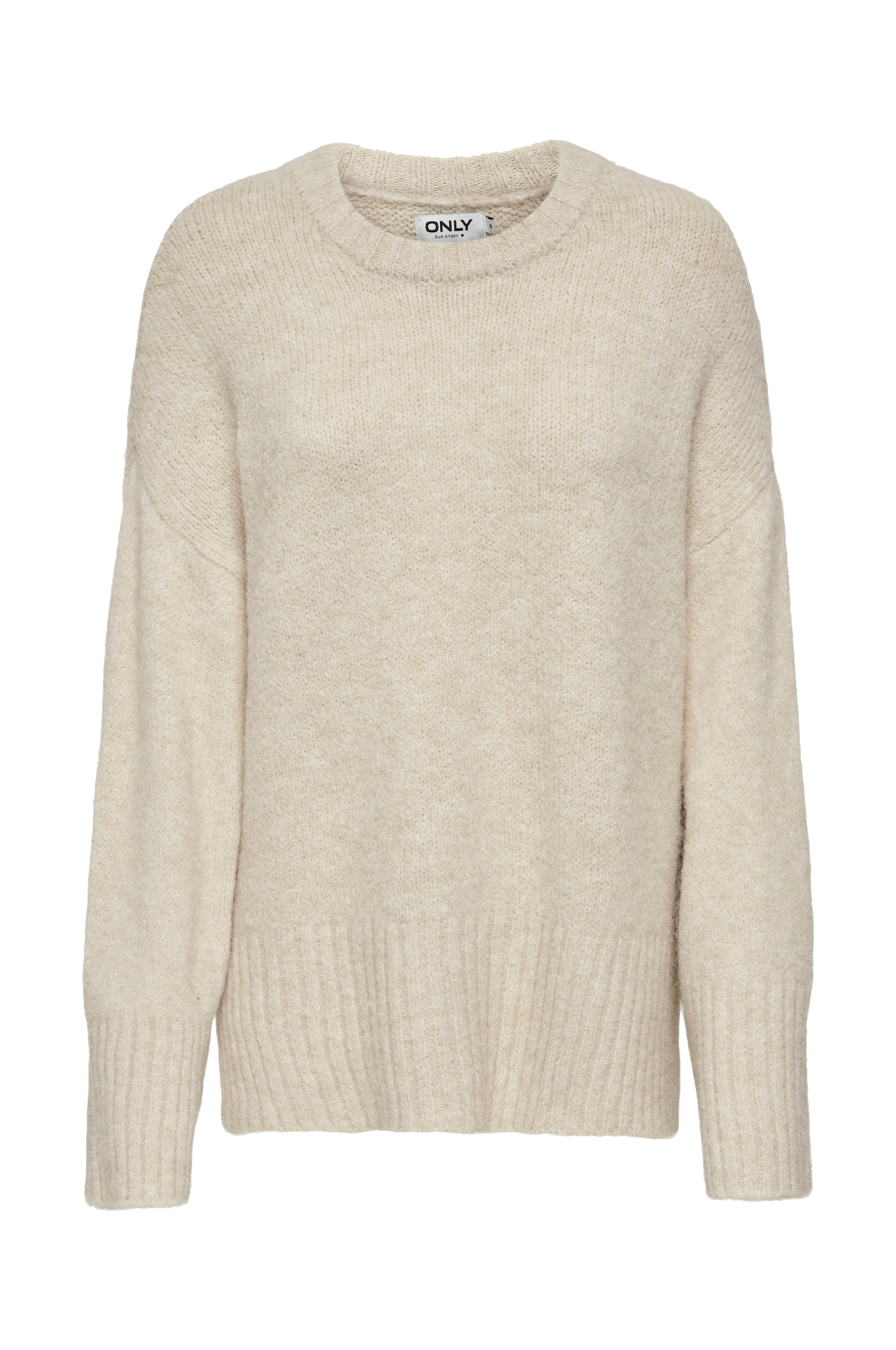 • Lige, uformel model• Halsudskæring med ribkant• Nedsænket skulder• Langt, lige ærme med bred ribstrik nederst• Ribstrikket søm med slids i siderne