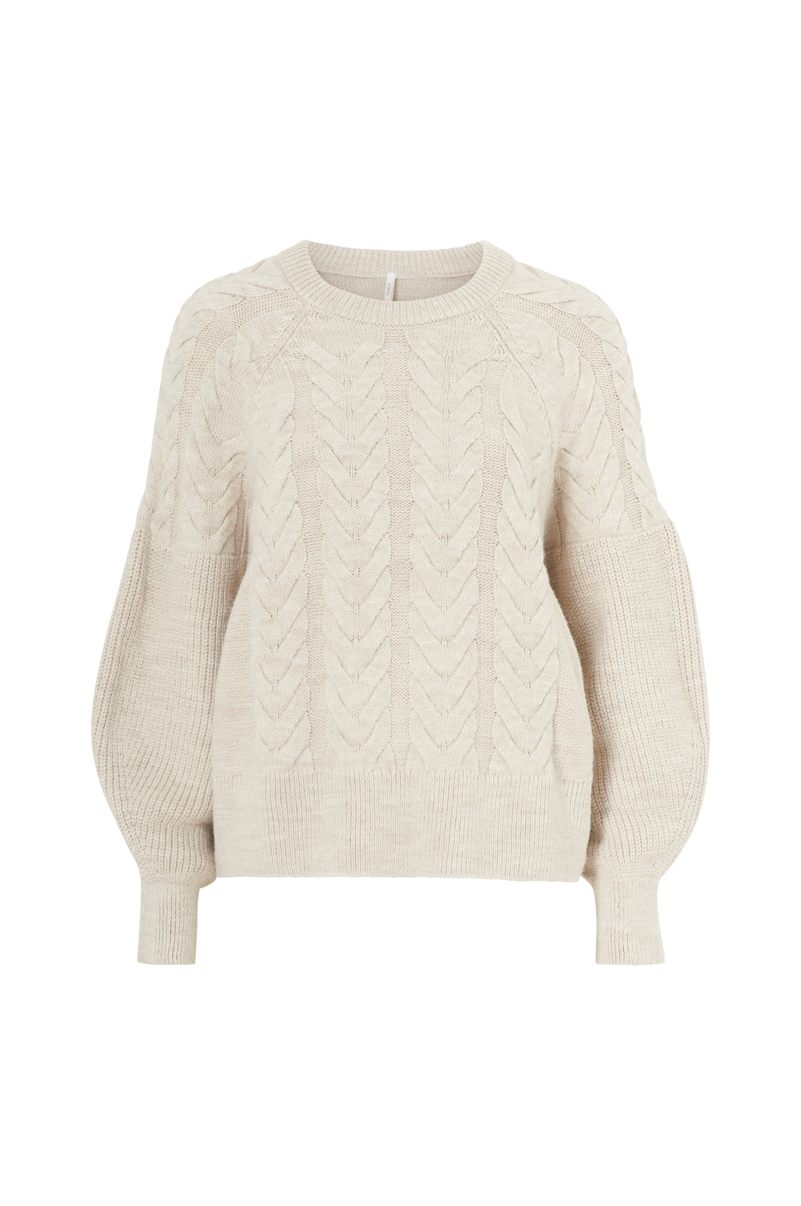• Kabelstrikket forside• Glatstrikket bagside• Brede ærmer med ribstrikket manchet