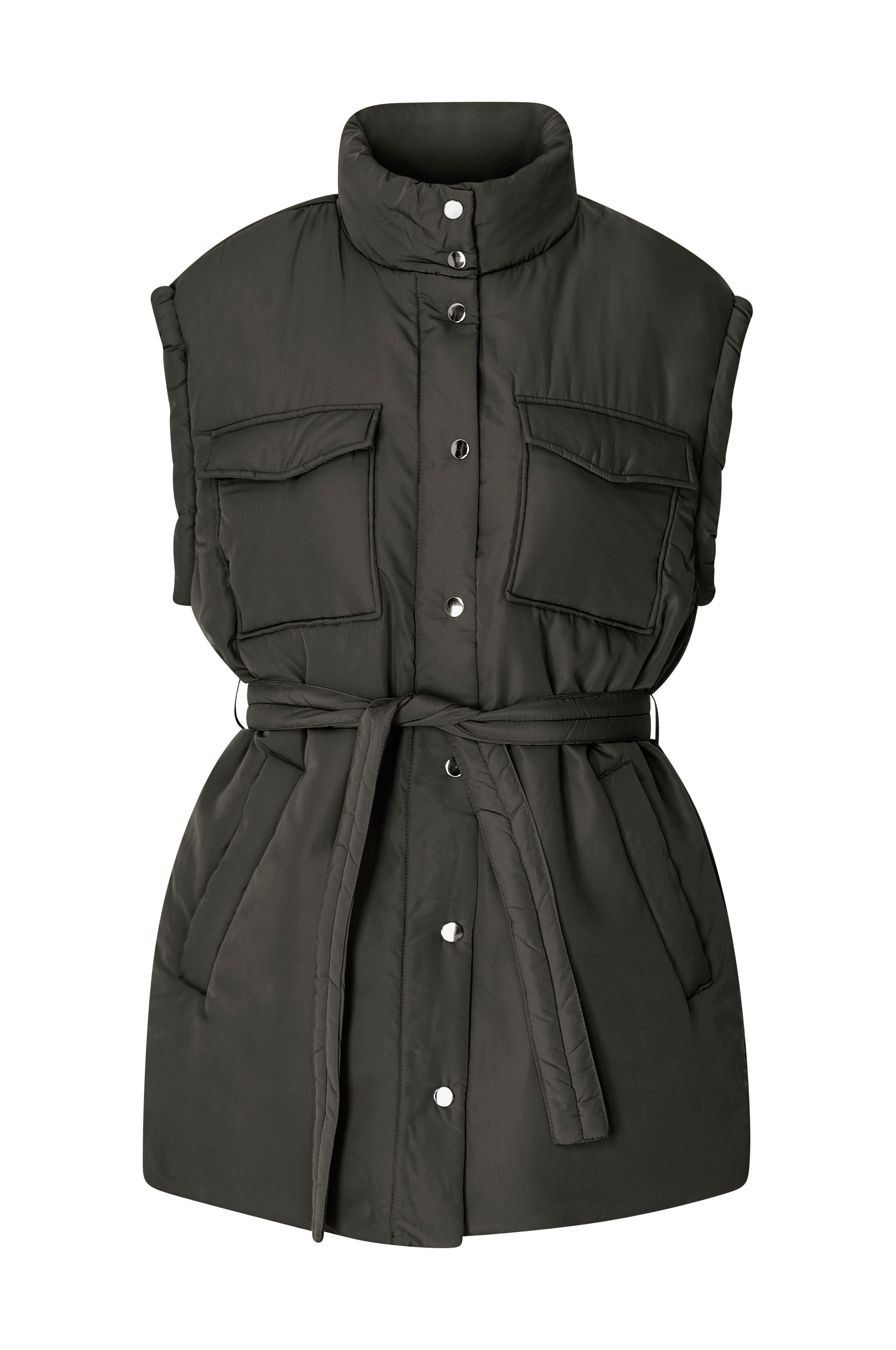 • Foret vest• Høj krave• Trykknapper• Aftageligt bæltespænde ved taljen• To lommer nederst• To brystlommer med trykknapslukning• Længde: 80 cm i størrelse S