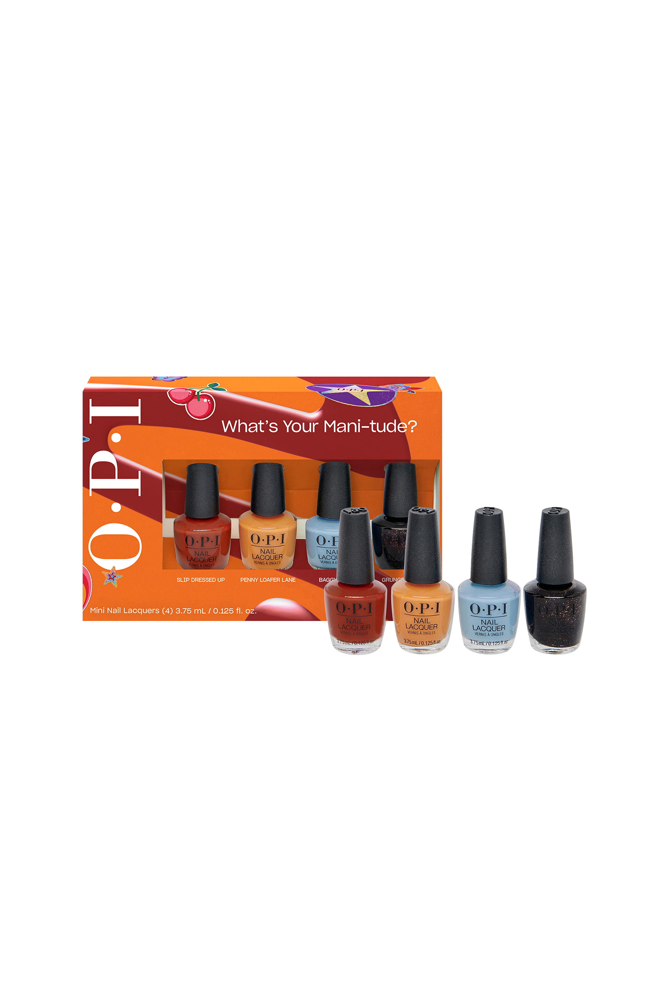 Oplev Opi's nye efterårskollektion - Mani-tude Collection. Opi introducerer en palet af dybe, mættede crèmes og shimmers med et moderne twist på 90'ernes throwback-stemning. Kollektionen omfatter 12 unikke nuancer i Nail Lacquer og 12 unikke nuancer i Infinite Shine. Intet siger 90'erne som mini-neglelakker. Få dette mini-neglelak-sæt med 4 dele og prøv 4 nye nuancer fra What's Your Mani-tude?