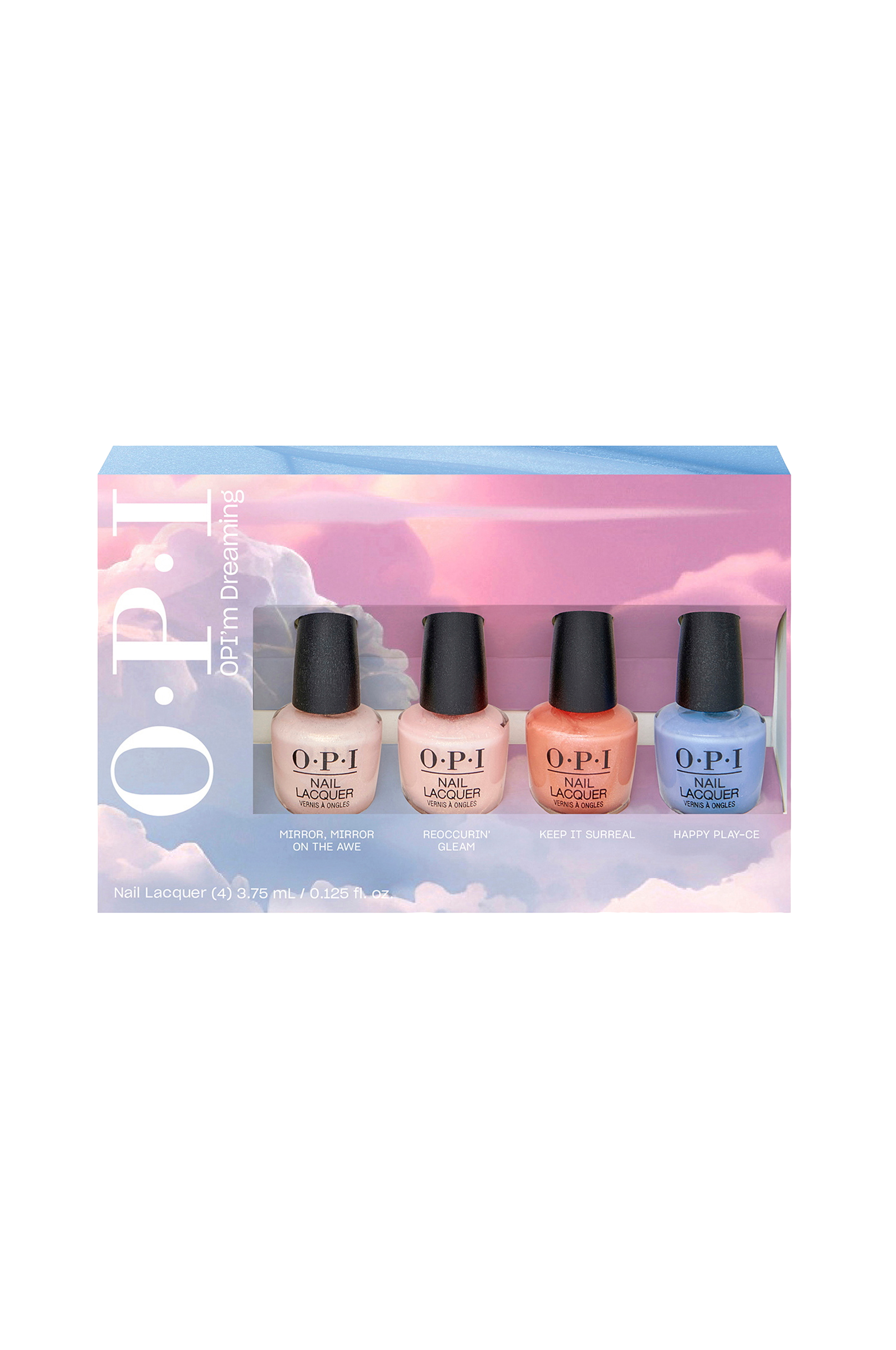 Dette sæt indeholder 4 mini OPI'm Dreaming-nuancer (1 pr. nuance): Mirror, Mirror on the Awe, Reoccurin' Gleam, Keep it Surreal, Happy Play-ce