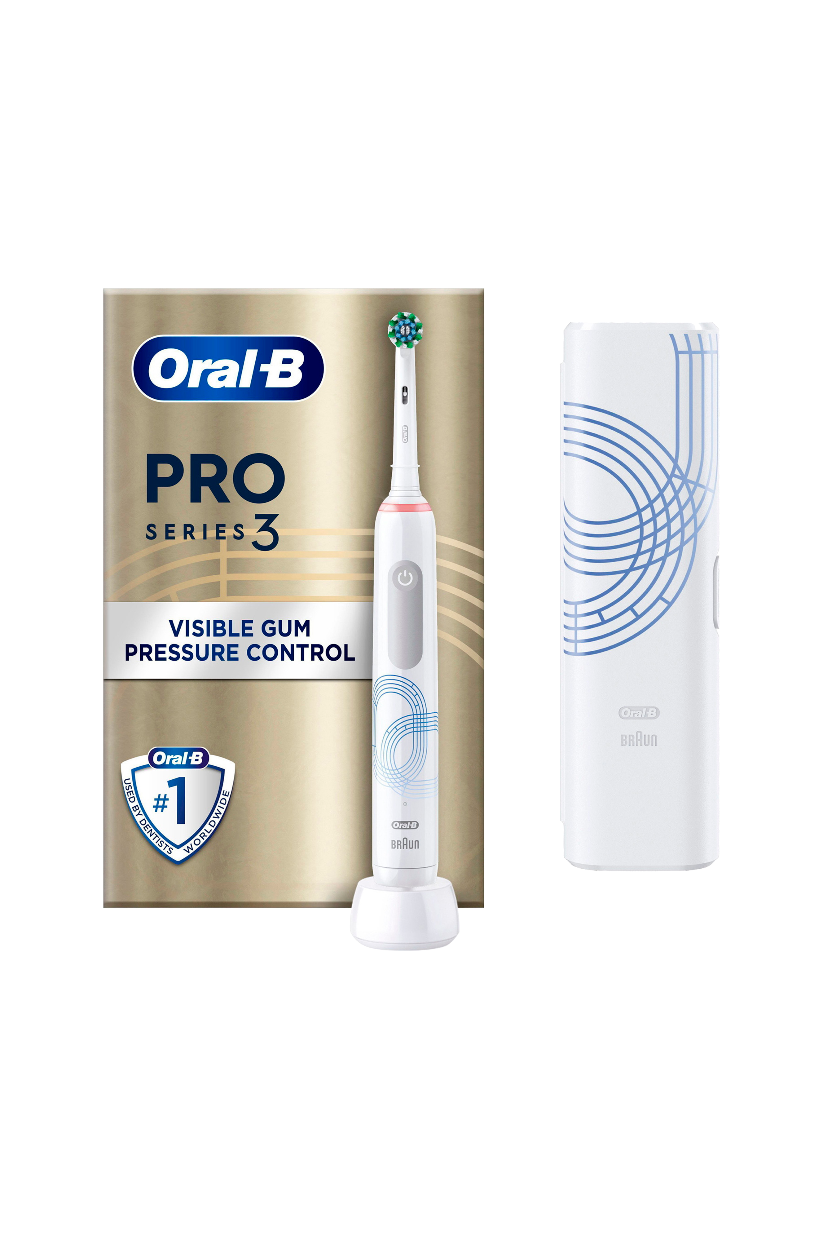 Oplev Oral-B Pro Series 3. Den professionelle timer i el-tandbørste Series 1 hjælper dig til at børste de 2 minutter som tandlæger anbefaler og minder dig hvert 30. sekund om at børste i et nyt område. Du skal bare flytte børsten rundt i munden, så gør Oral-B's unikke runde hoved resten. Den fjerner op til 100% mere plak end en almindelig tandbørste for sundere tandkød og fjerner overfladiske misfarvninger for hvidere tænder allerede efter første brug. Desuden hjælper tandbørsten dig med at beskytte tandkødet ved hjælp af 360° tryksensorteknologi, som sætter børstehastigheden ned og gør dig opmærksom på at børste mere skånsomt, hvis du børster for hårdt.