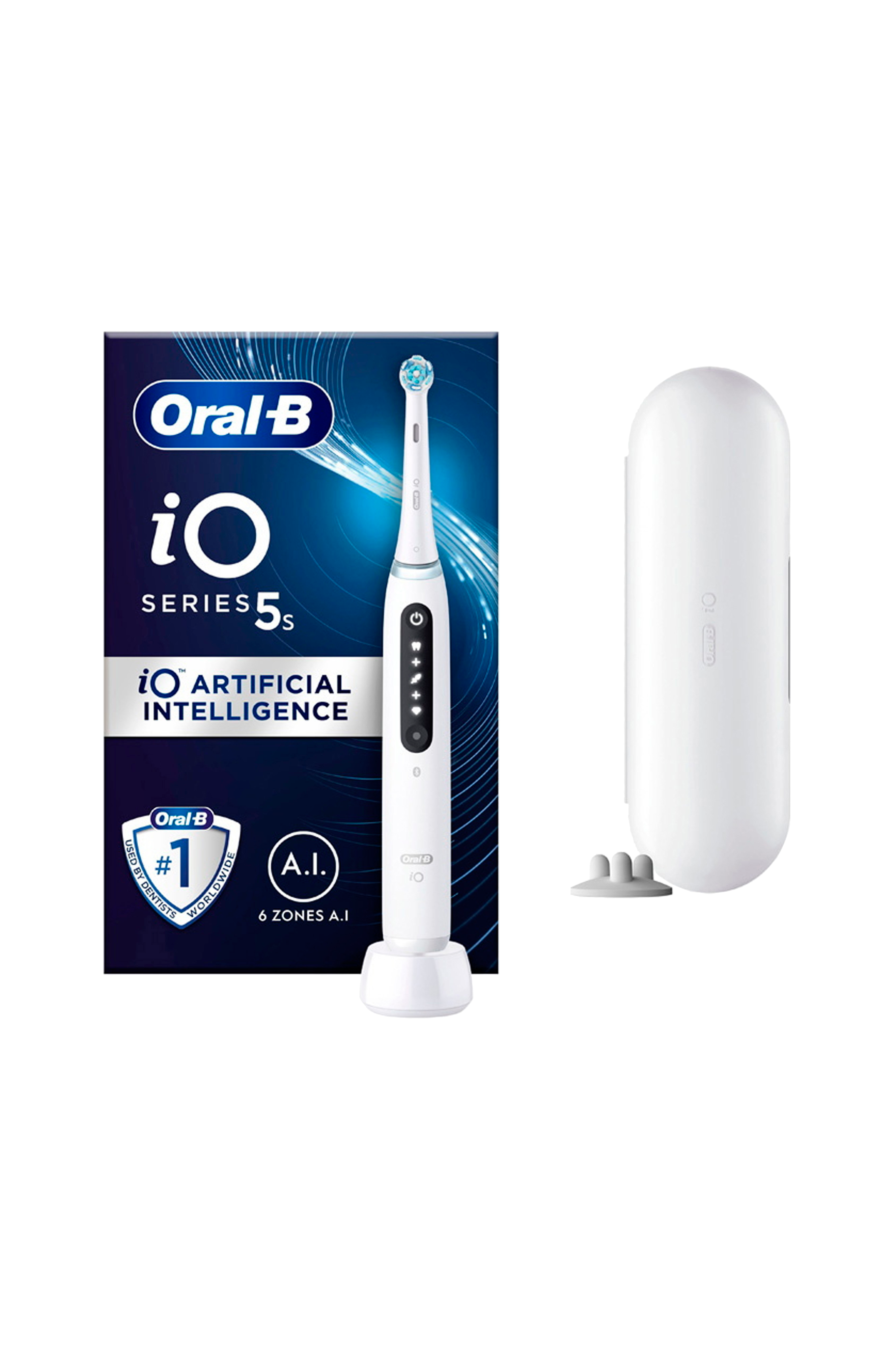 Indhold: 1 iO5-håndtag, 1 børstehoved, 1 rejseetui, 1 oplader, 1 holder til børstehoved.