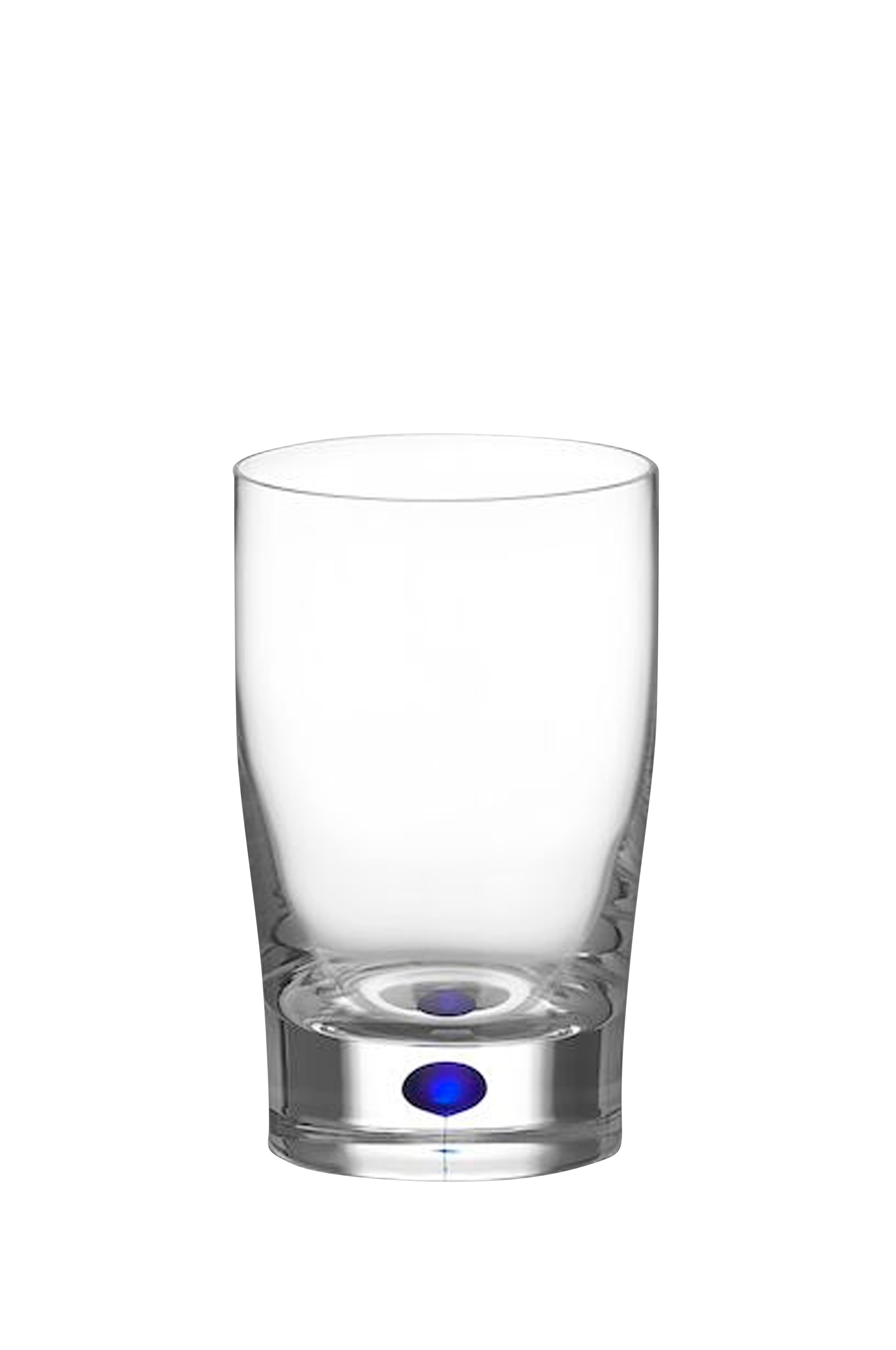 Intermezzo Tumbler fra Orrefors er designet i 1984. Glasset, der rummer 25 cl, er et universalglas, der egner sig til en lang række drikkevarer. Glasset er frem for alt fremragende til bordvand, der skal bruges sammen med vinglassene. Glasset er mundblæst i Sverige af dygtige glaspustere, med en blå dråbe indesluttet i bunden - en innovation baseret på traditionelt håndværk. Designet af Erika Lagerbielke.