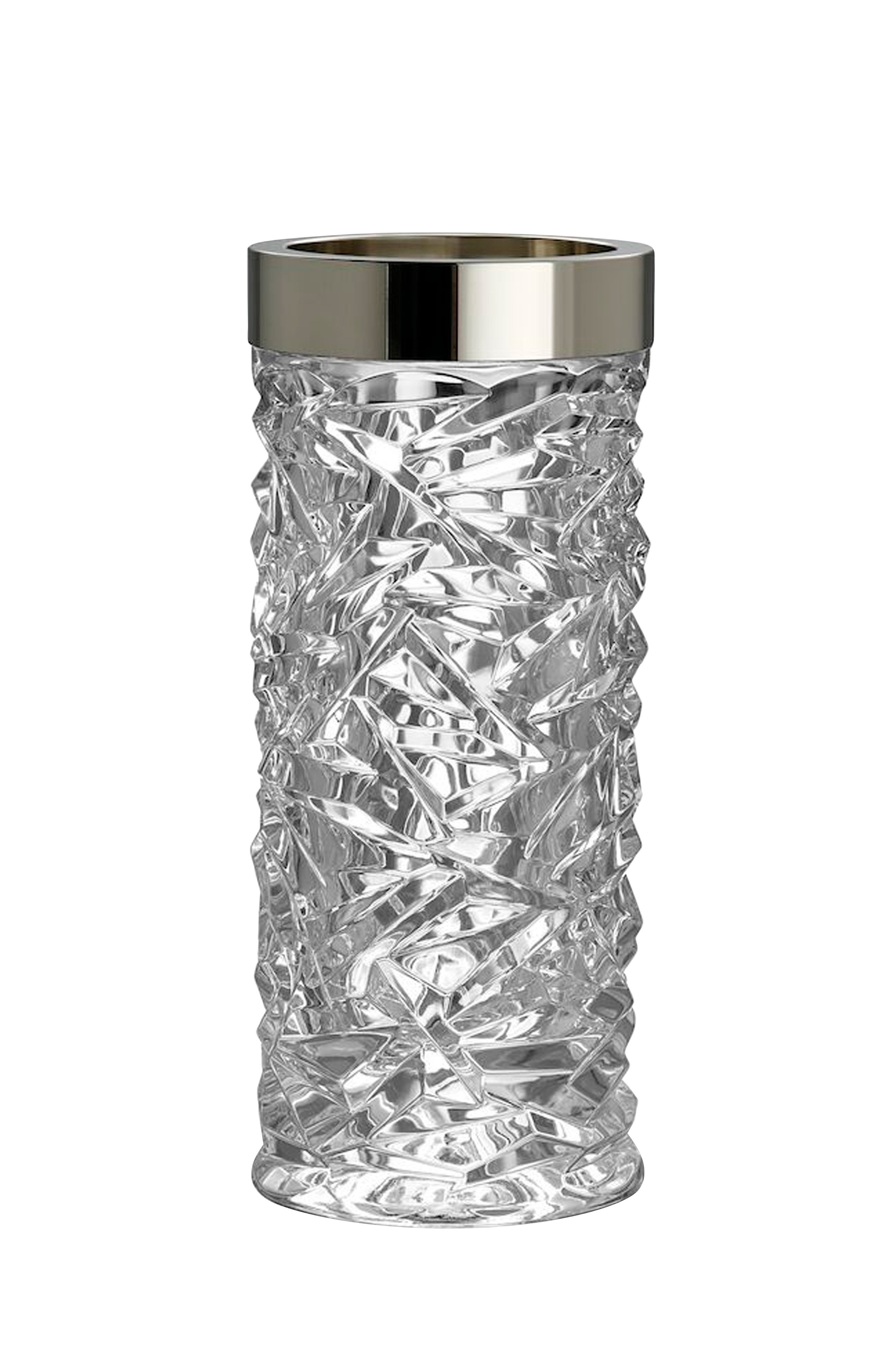 Cylindervase i glas med kant af rustfrit stål. Carat-serien er baseret på en nutidig fortolkning af traditionel glasslibning, der har gjort Orrefors verdensberømt. Den uregelmæssige geometri skaber smukke lysreflektioner i krystalglasset. Design: Lena Bergström.