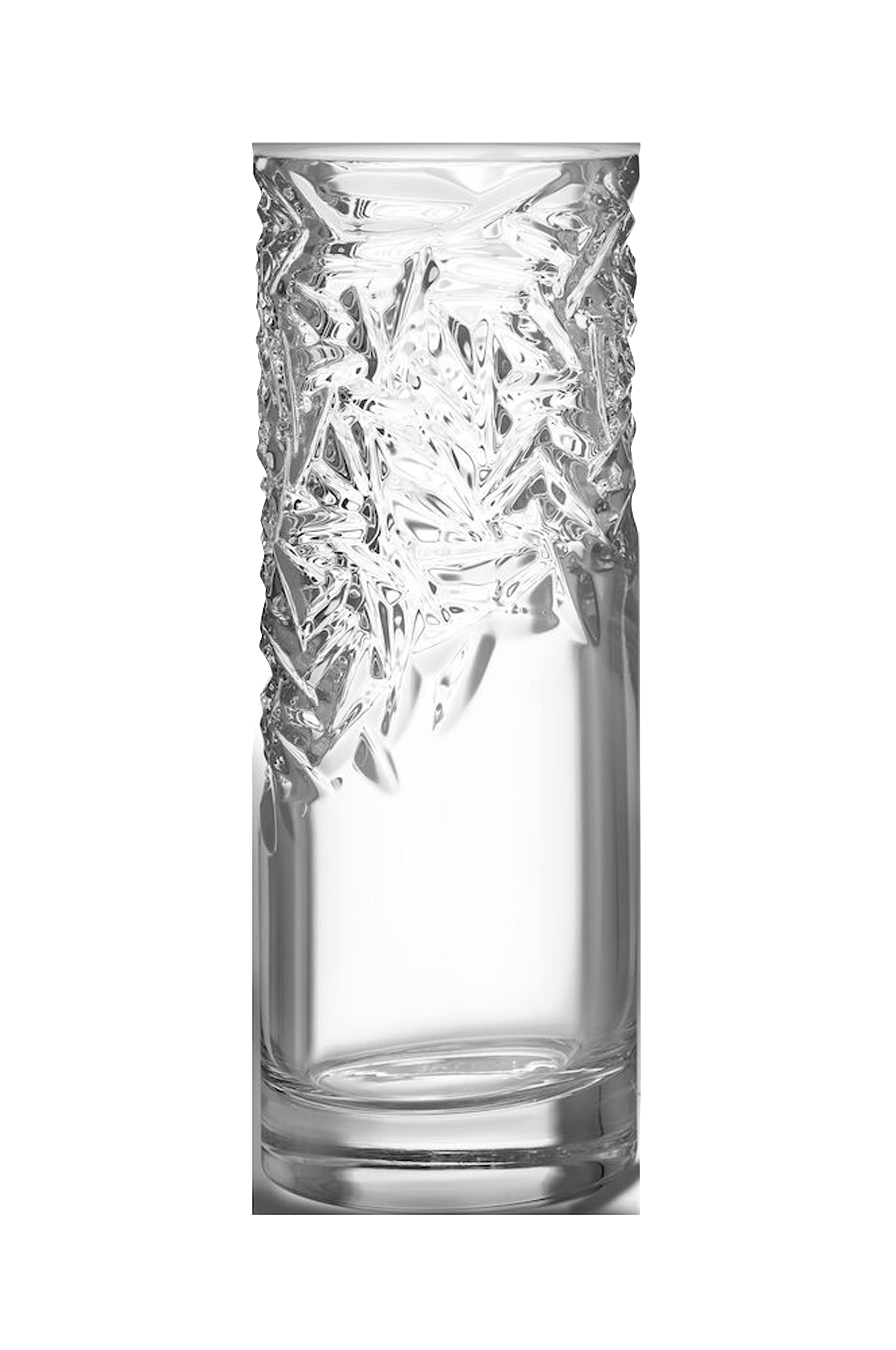 Den store cylindervase har et uregelmæssigt mønster foroven som kontrast til det glatte glas. Velegnet til højere afskårne blomster eller bare grene.