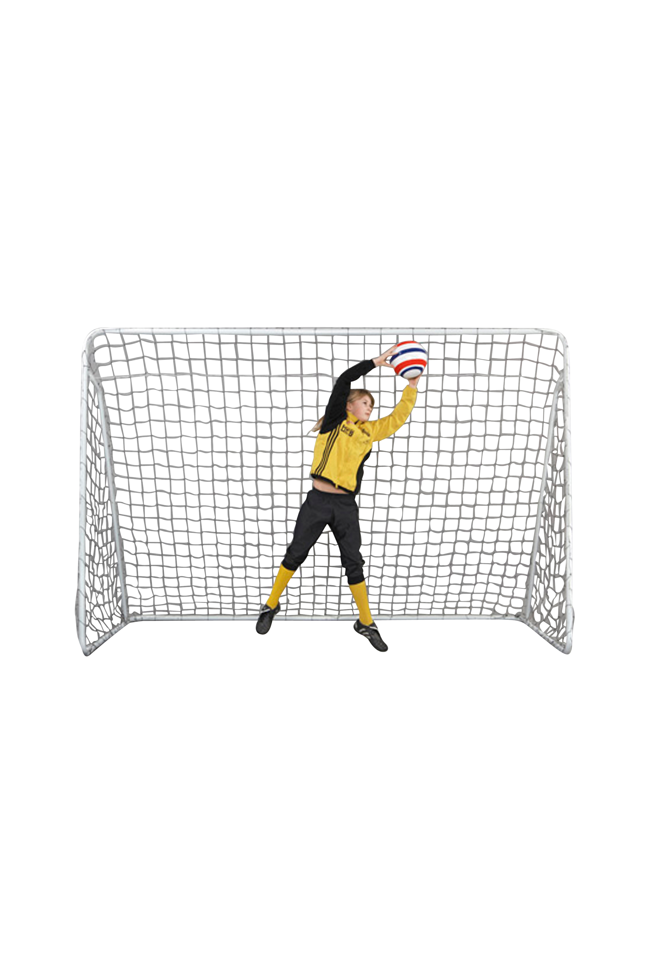 Et kraftigt fodboldmål på hele 3x2x1,2 meter! Kraftige metalrør (32 mm i diameter), ægte nylonnet og fem metalpinde som fastgører målet i græsset.